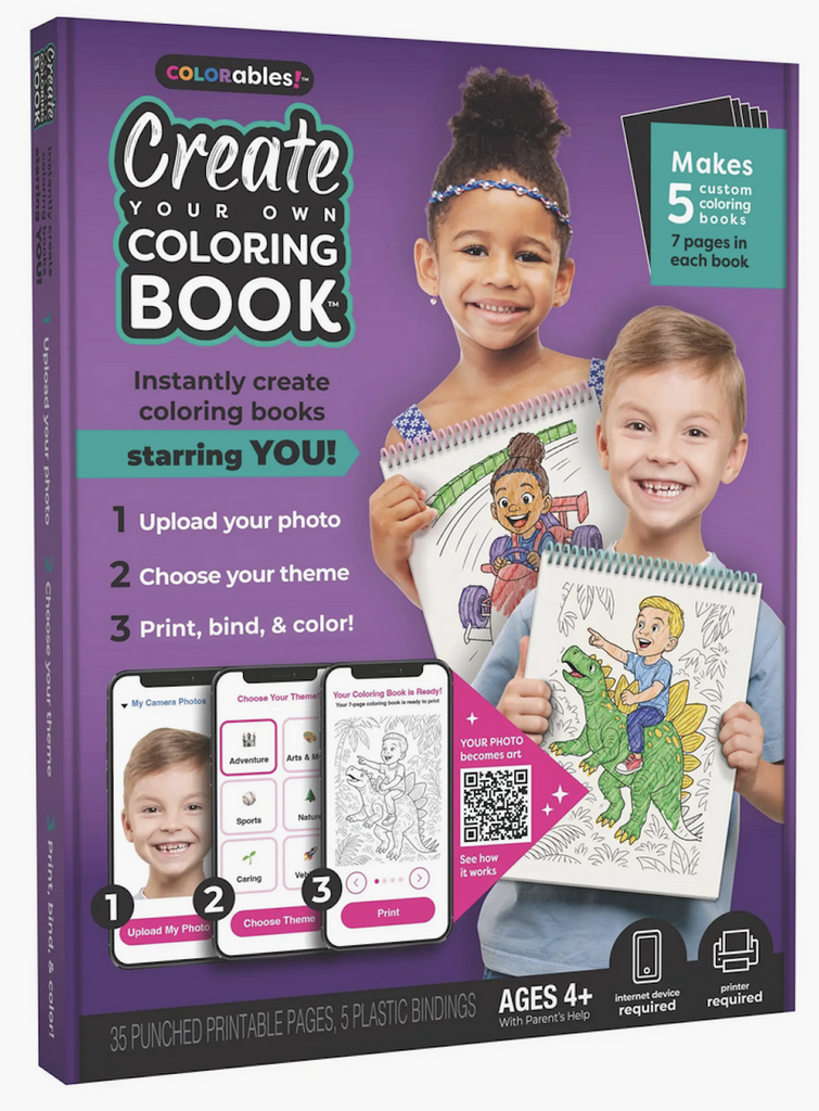 Create Customized Coloring Books at Home! Any photo is transformed into a multi-page coloring book in seconds, featuring a person from your photo. Choose from dozens of themes likes adventures, magic, and dinosaurs to embed your cartoonized character! With no apps to download, simply scan the included QR code, select a photo from your photo library, and watch your coloring book magically come to life. Each coloring book design is made to be printed from your home printer. Any regular old printer will work. Simply feed to included punched paper sheets in so that your designs are ready to be easily bound with the included spirals. Ages 4+ with parents help.