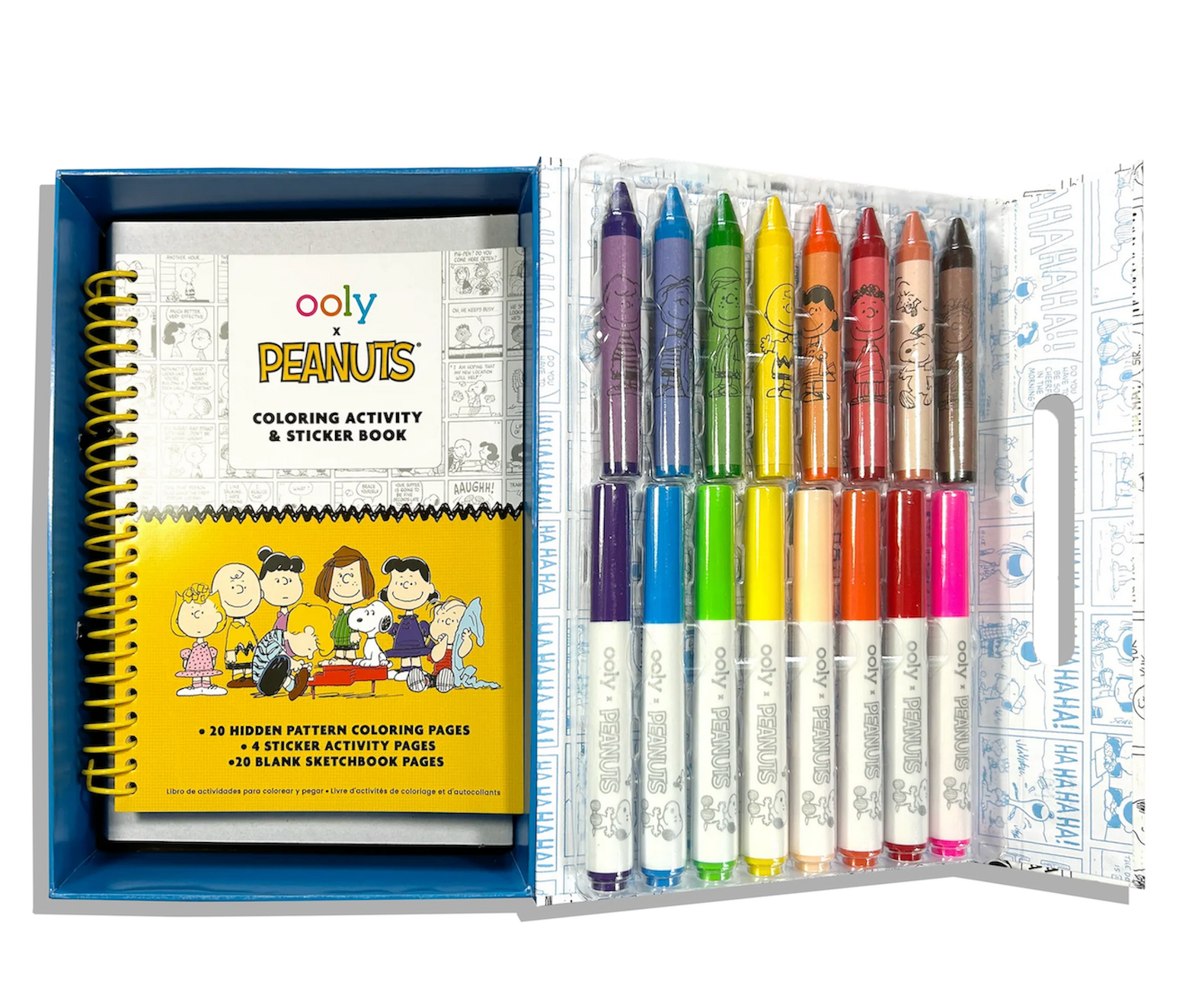 The OOLY x Peanuts Coloring Activity & Sticker Kit is a must-have coloring kit for kids who love Snoopy, Charlie Brown, and the Peanuts gang! This all-in-one sticker activity set includes everything needed for hours of creative fun. Inside, you’ll find 8 jumbo washable markers plus 8 jumbo crayons for oodles of coloring options - perfect to go along with a Peanuts themed coloring book featuring 20 white paper sheets, 20 hidden pattern reveal character sheets, and 4 Peanuts-themed sticker sheets to pair with activity pages. Ages 3+