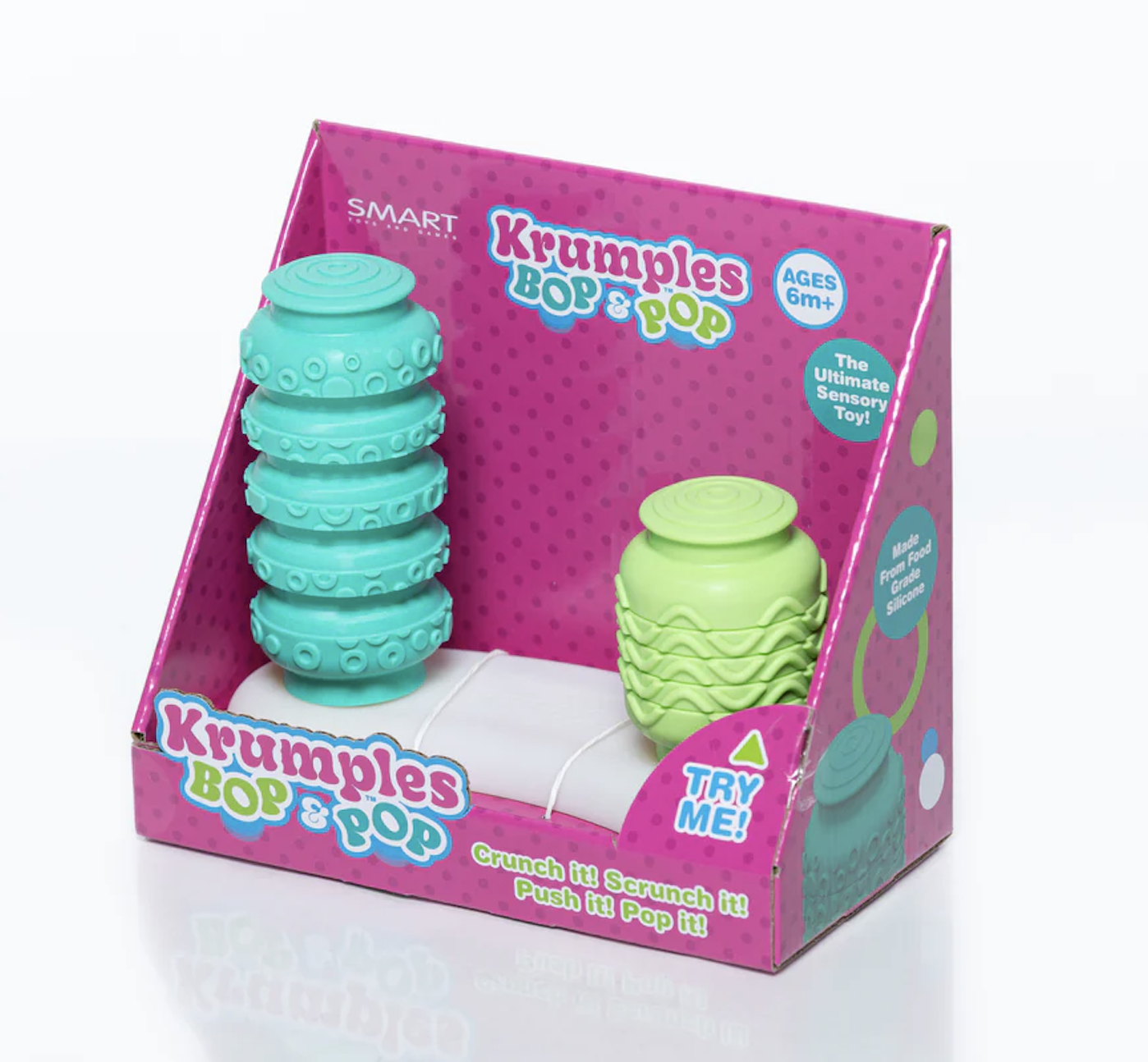 Double the fun, double the play! Krumples BOP & POP is the next evolution of the beloved Krumples sensory toy, now designed with two connected pieces that move in unison—when you squish one, the other pops up! Made from 100% food-grade silicone, it’s safe for curious hands and mouths while providing endless tactile engagement. Crunch it, scrunch it, push it, pop it—your little one won’t want to put it down! Dishwasher-safe silicone. Ages 6 months+.