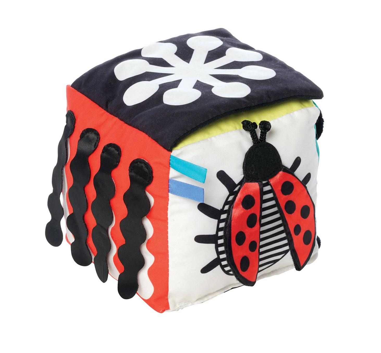 Sensory textures and peek-a-boo surprises are found on every side of this 6-sided discovery cube. Babies will love to explore every inch of this remarkable soft cube that features a baby-safe mirror under a soft fabric flap, textured fabrics, colored ribbons, and a squishy-soft design. Ages 3m+.