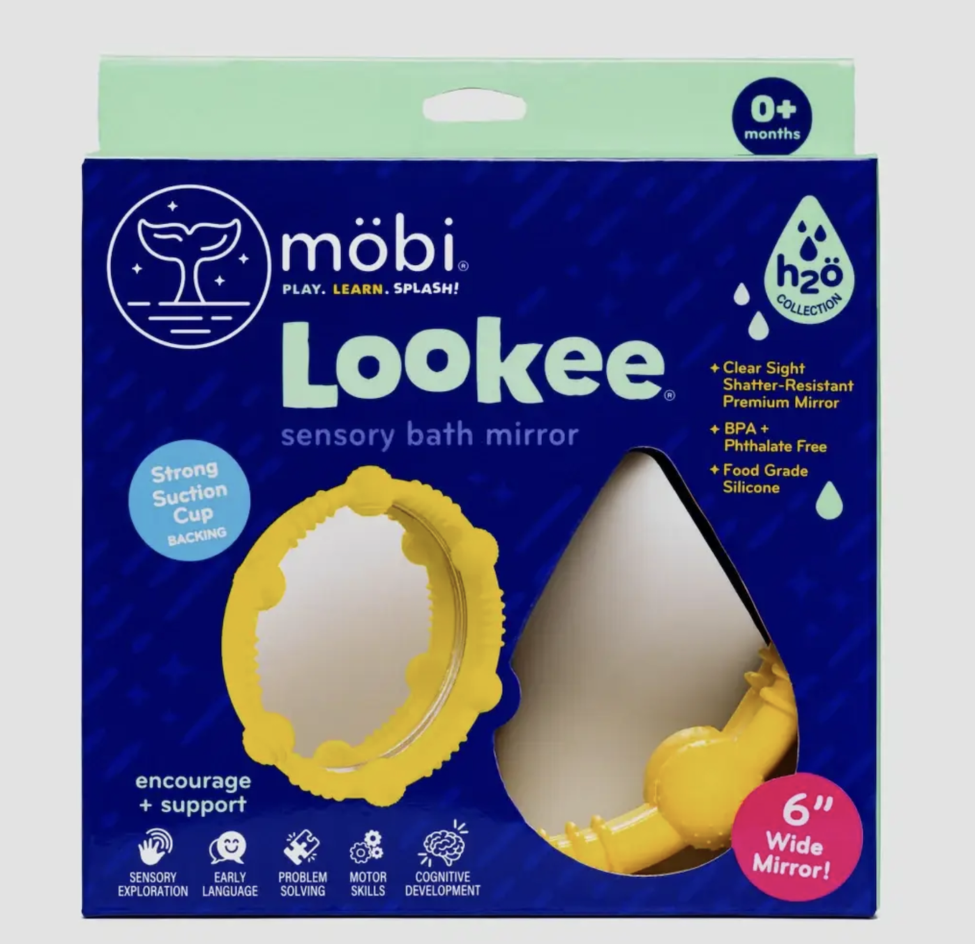 LOOKEE Bath Mirror makes tub time a splashing good time! This bright, sensory mirror is perfect for little ones to explore while they soak in the suds. LOOKEE encourages curiosity, giggles, and interactive play, turning bath time into a fun-filled adventure. Watch as your child delights in their reflection and engages with this playful addition to the bath because with LOOKEE, every bath is a new discovery! Clear Sight, Shatter-Resistant Premium Mirror. BPA + Phthalate Free. Food Grade Silicone. Ages 0+.