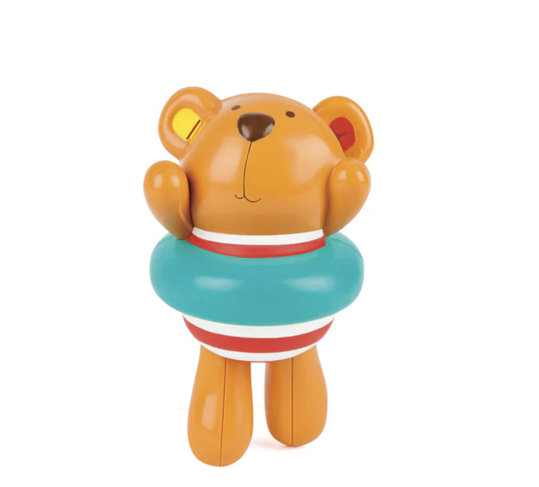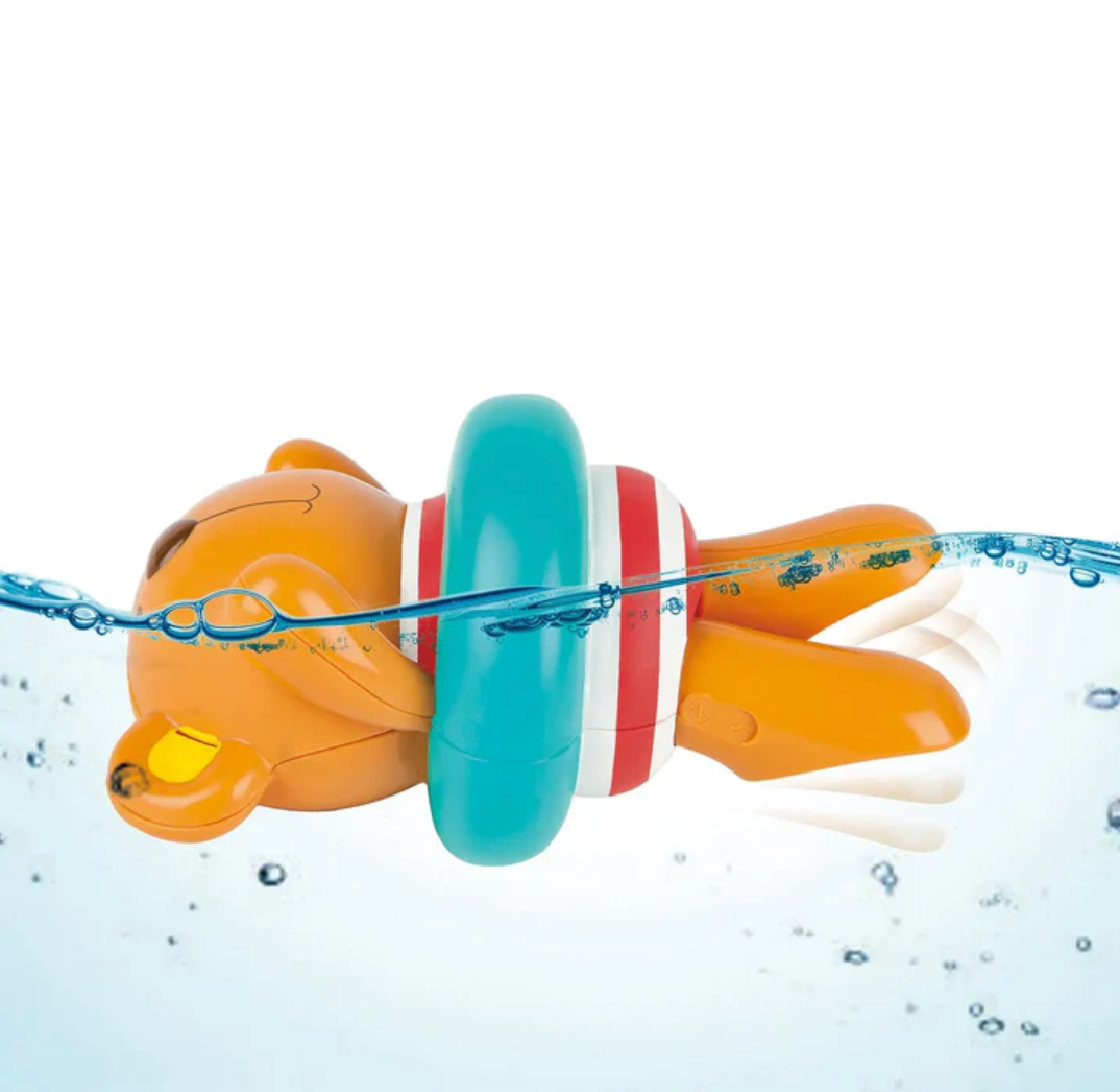 The swimmer teddy wind-up toy is secured with a bright blue swim ring, just wind up the water play toy and watch it swim around the bathtub, baby bathtub or pool. The bathtub toy has holes on the ears that can be used to drain water. This encourages children to interact and participate in water-play and keeps bath time fun! Ages 1 & up.