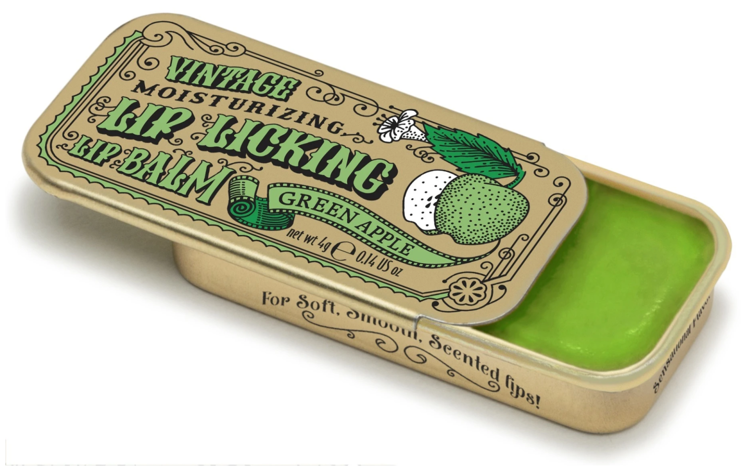 This Lip Licking flavored lip balm for soft, smooth scented lips brings back sweet memories! Our flavored lip balm formula is NOW organic & natural made with only the finest, top of the line ingredients & proudly MADE in the USA Slide back the lid of this gold vintage slider tin to find the delicious scent of sweet Green Apple housed inside. Lip Balm is slightly tinted but once applied it appears clear.