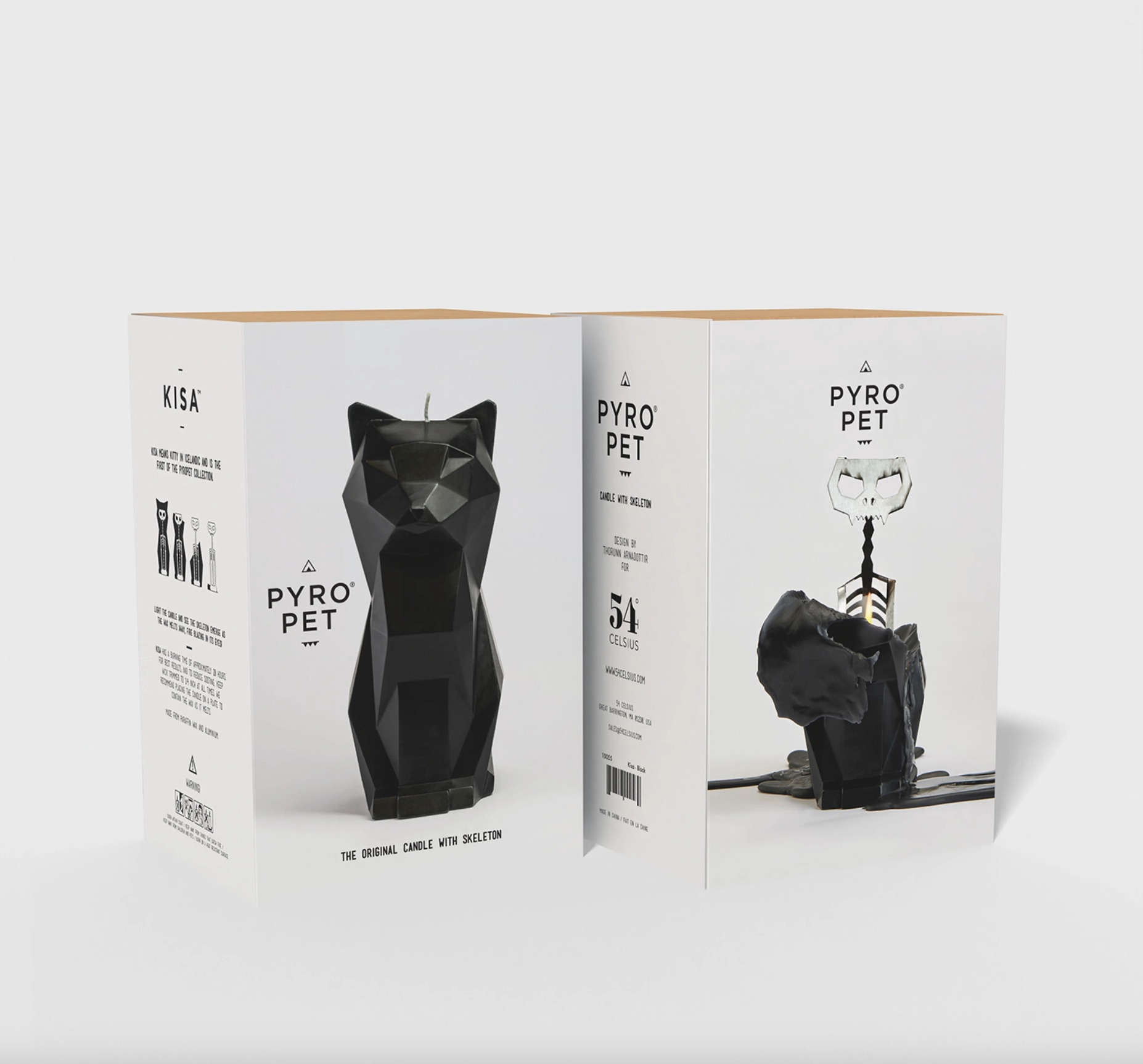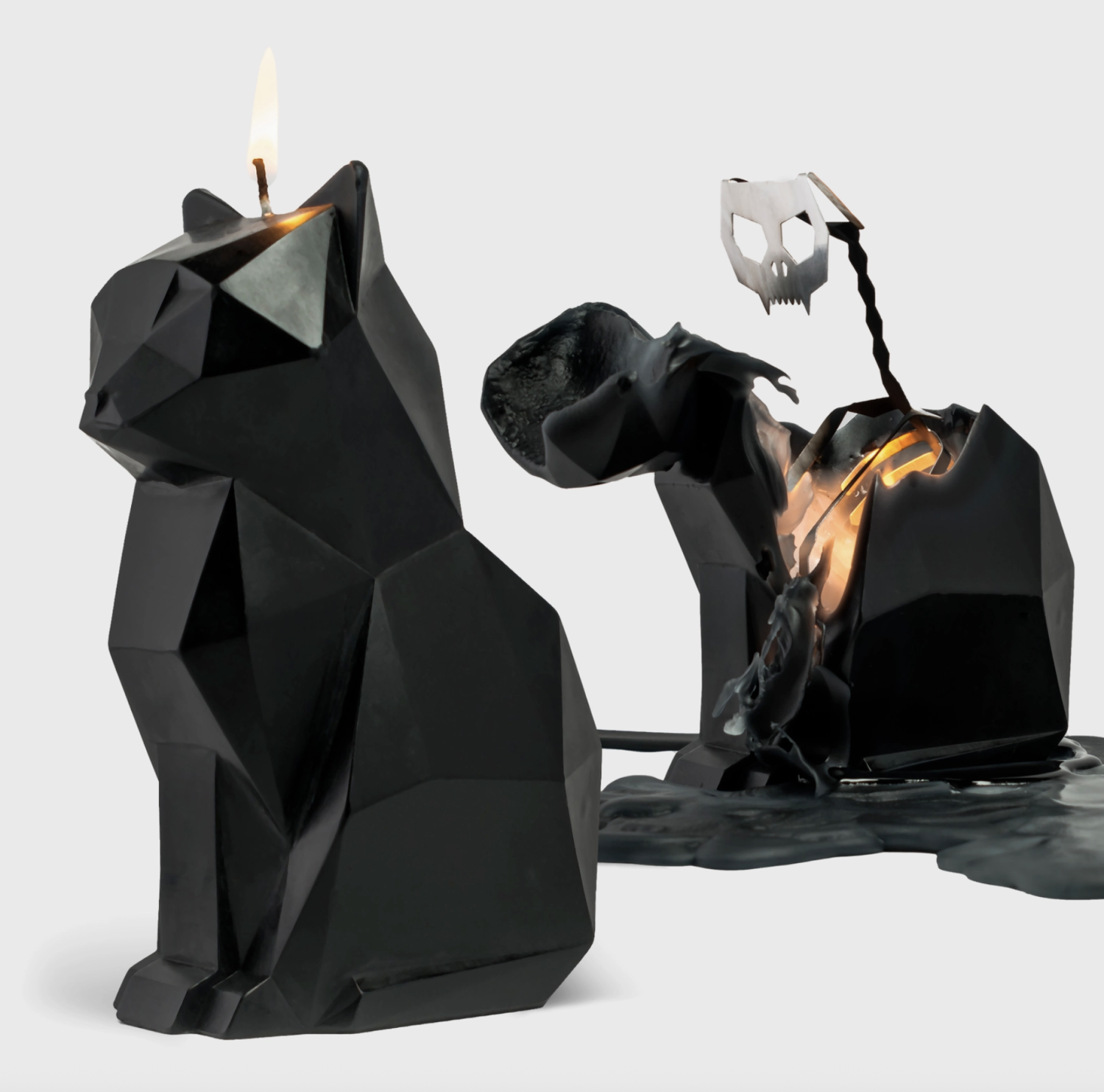 Here kitty kitty. Your pretty new pet has a beast within. Watch as the flame reveals a metallic, skeletal surprise. We think it’s just purrrr-fect. Each Pyropet has an aluminum skeleton inside that is slowly revealed as the candle melts. Paraffin wax. Burn time approx 30 hours. 4.5 x 6.7"