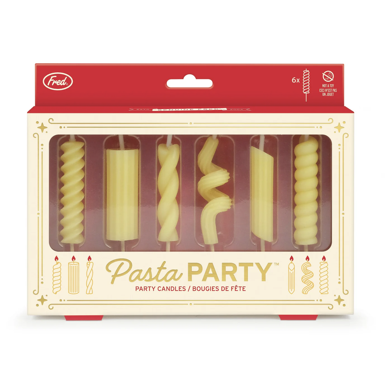 Time to get Fusilli. Add a clever twist to your next celebration with Fred’s Pasta Party. These quirky candles, crafted to look like 6 classic pasta shapes, are sure to add a deliciously fun touch to any event. Standing about 3" tall, the candles are packed in a colorful window box with gold foil accents.
