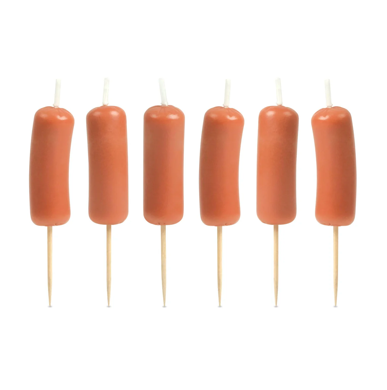 It’s a wiener wonderland. Let’s be frank, regular party candles just don’t cut the mustard. These Sausage Party candles bring the sizzle to any relish-worthy milestone. Each cocktail weenie stands 1.8" tall on a wooden pick for easy placement. Set of 6, packed in a gift-ready box with gold foil accents.
