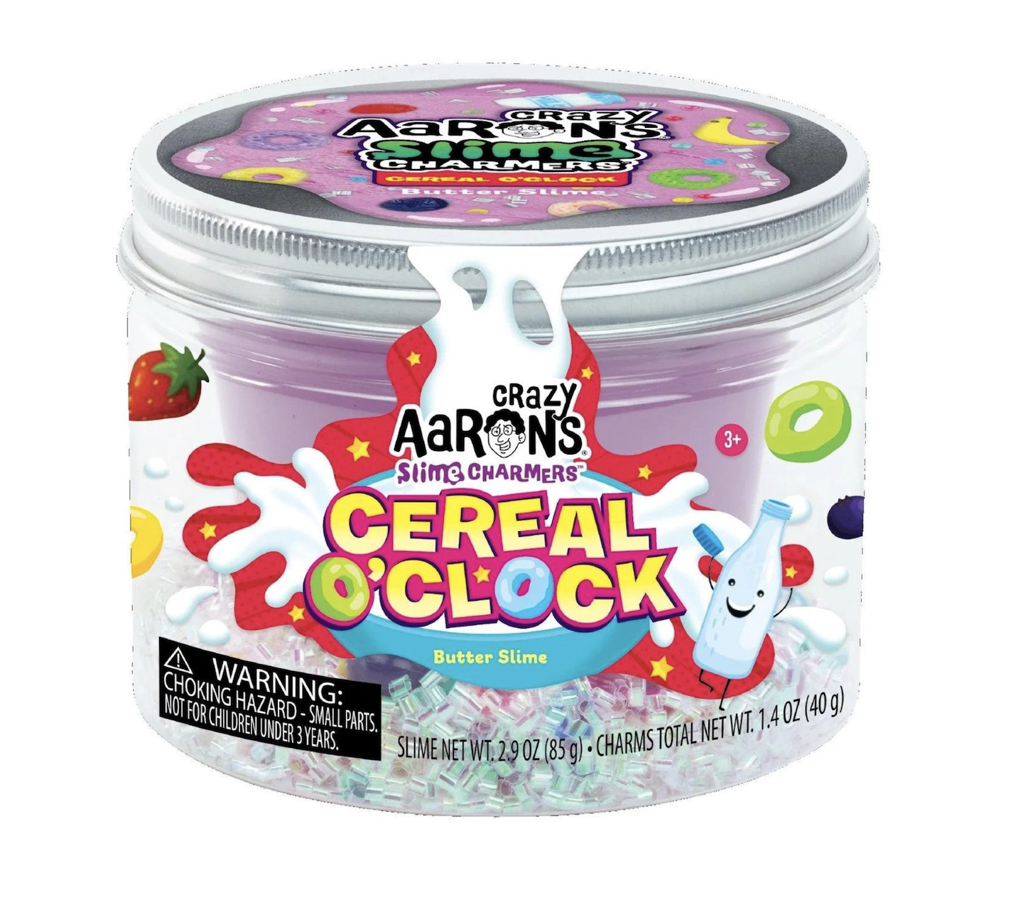 What time is it? It's Cereal O'Clock, of course! Get ready for a bowl full of fun with this smooth, fuit cereal scented, purple butter slime. Crazy Aaron's® Cereal O'Clock Slime Charmers(tm) comes with white bingsu beads for the perfect crunchy texture and cereal-themed charms to mix in. Squish, stretch, and swirl your way to a playful slime adventure that's as fun as your favorite breakfast! Ages 3+.