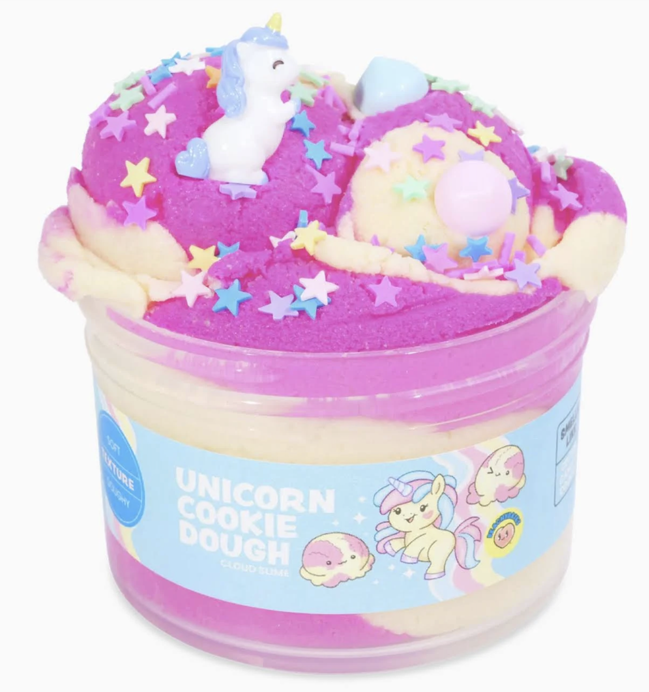 Peachybbies brings joy and sparkle to every slime session. The Unicorn Cloud Dough Slime has a soft, doughy texture and is infused with cotton candy cookie dough scent. Comes complete with unicorn themed charms, mix-ins and sprinkles. 7 oz. Ages 3+. * Slime is meant to be played with, never eaten. Do not eat. This is not a food product.
