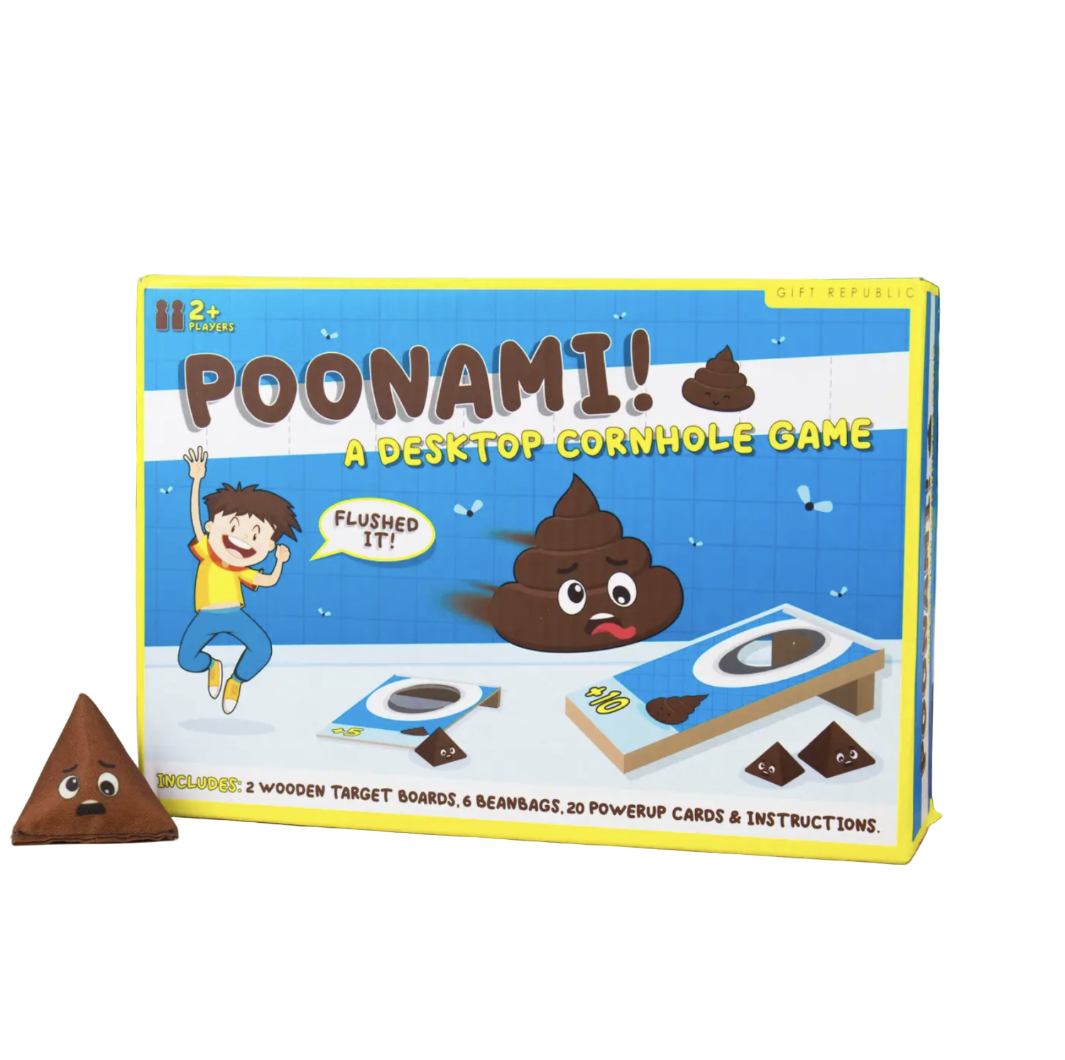 Join the potty party and see who can make the biggest splash with Poonami! This hilariously poop-tastic desktop game will have you and your friends tossing poop bean bags into the targets to score the highest points and crown yourself as king of the toilet throne. Includes 2 wooden target boards, 6 beanbags, 20 powerup cards, and instructions. 2 players. Ages 8 & up.