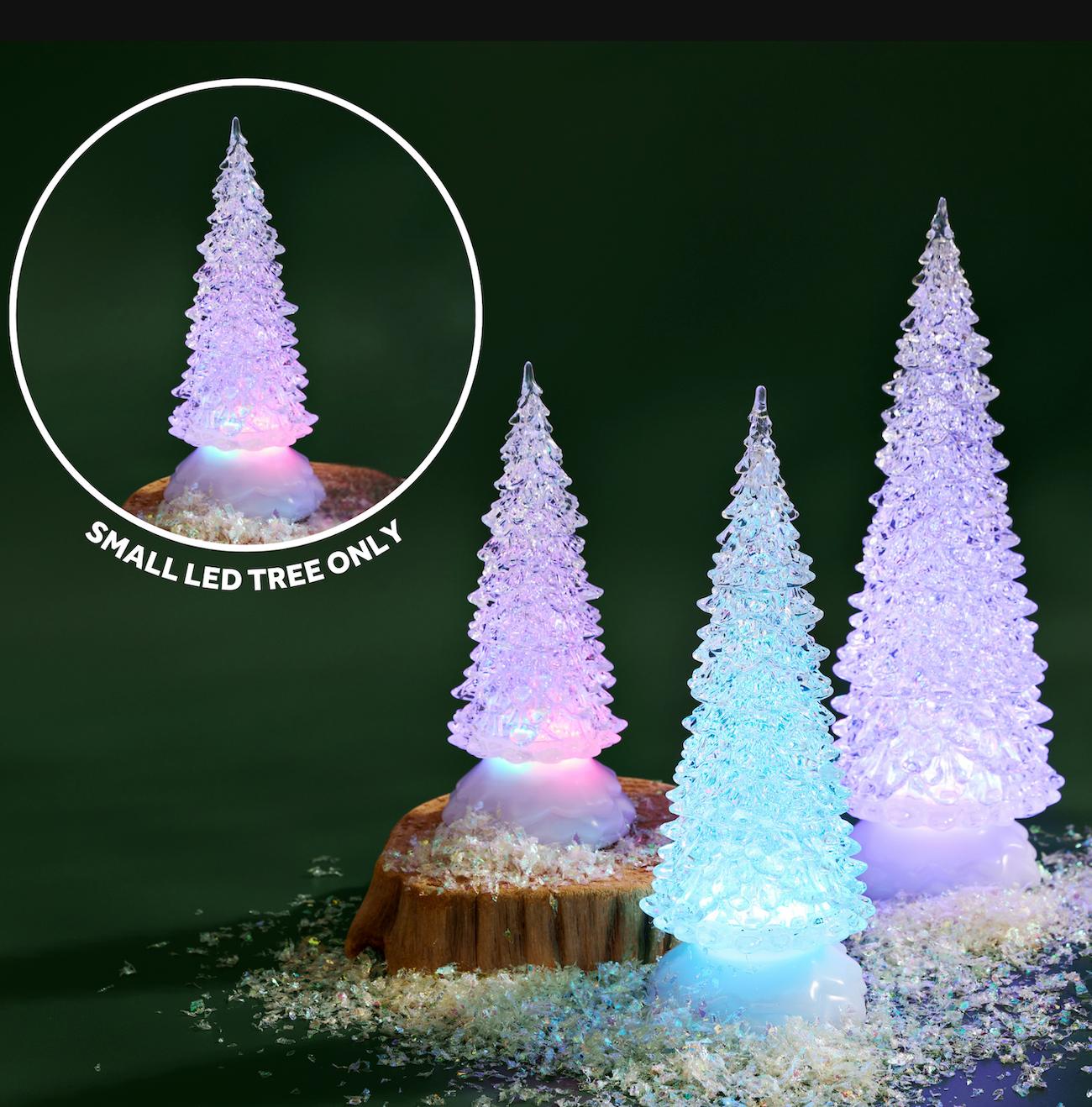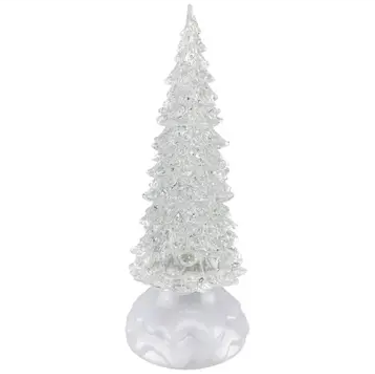 Offer eye-catching Christmas charm with this color-changing LED tree! This standing tree is made of plastic and filled with liquid for a glittering snow globe effect. Warm LED lights glow from within, changing colors continuously between red, blue, green, and purple. Height: 8.46"