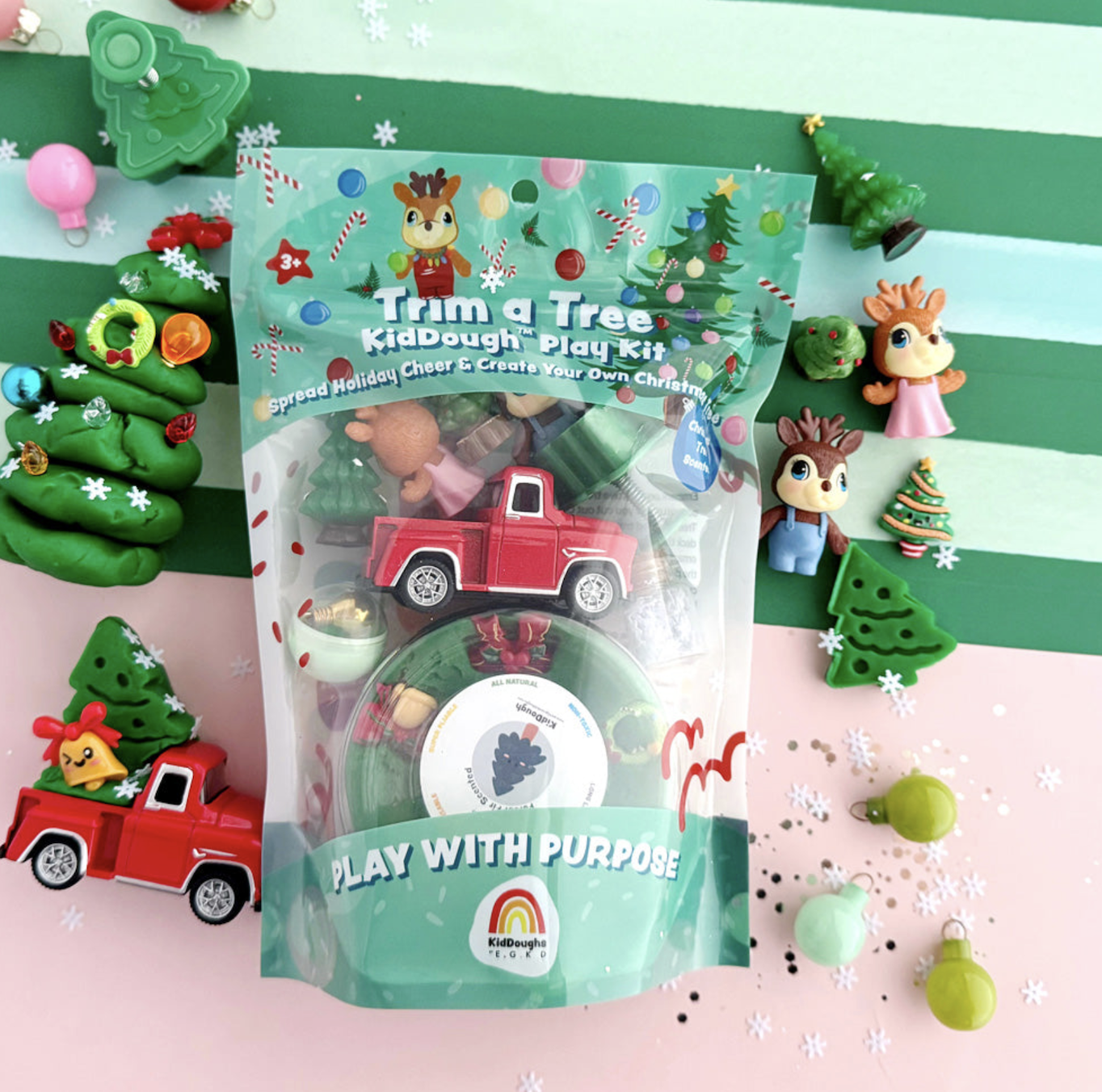 Mom invention alert! KidDough is a long-lasting super silky dough that’s made with non-toxic food-grade ingredients (free of nuts, soy, vegan). It’s taste-safe for curious kids and transports your little learner into a world of sensory storytelling fun. This Trim a Tree play kit comes with 8oz of Christmas Tree-scented green dough. Explore the holiday season with the included play elements: tree cookie cutter, glitter, play charms like trees, a red truck, reindeer, ornaments, and more. KidDough ingredients: Wheat Flour, Salt, Canola Oil, Cream of Tartar, Water, Food Coloring, Organic Potassium Sorbate, Fragrance. Ages 3+