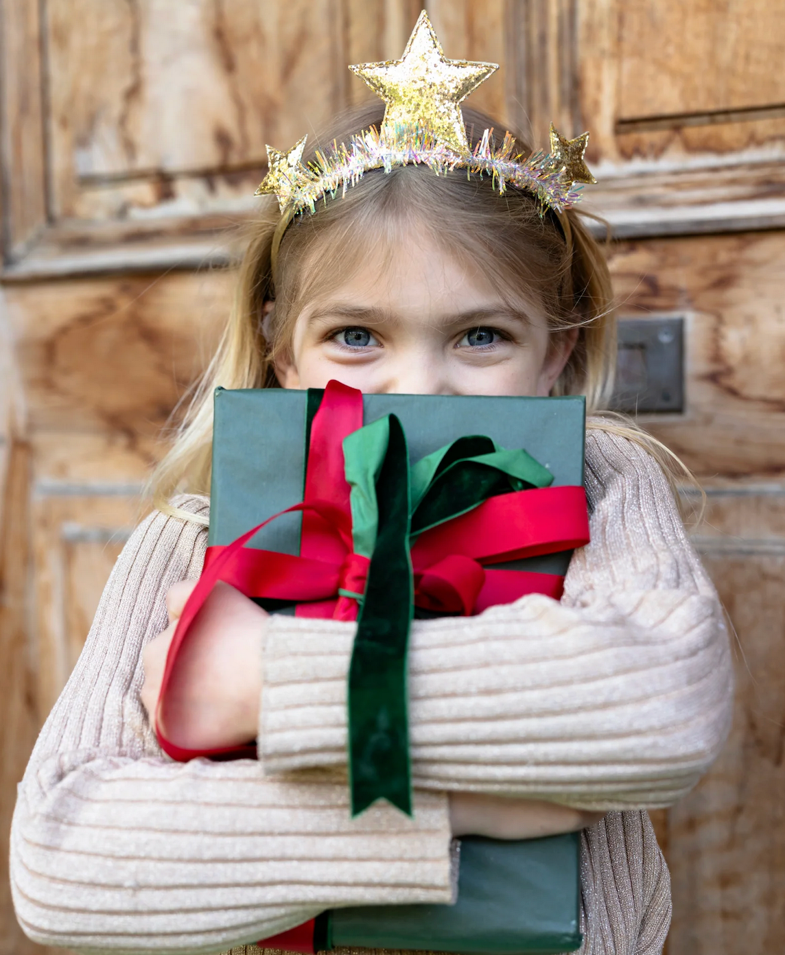 Add a twinkle to your holiday look with our Twinkle and Tinsel Star Headband! This playful accessory features three sparkly stars perched proudly on top, catching the light with every move. Wrapped in festive gold tinsel, the band brings instant cheer and shimmer to your outfit — whether you're dressing up for a Christmas party, caroling with friends, or just spreading holiday joy. Ages 3+