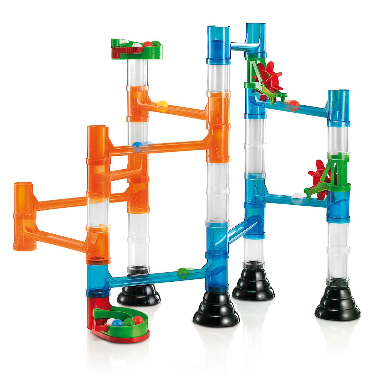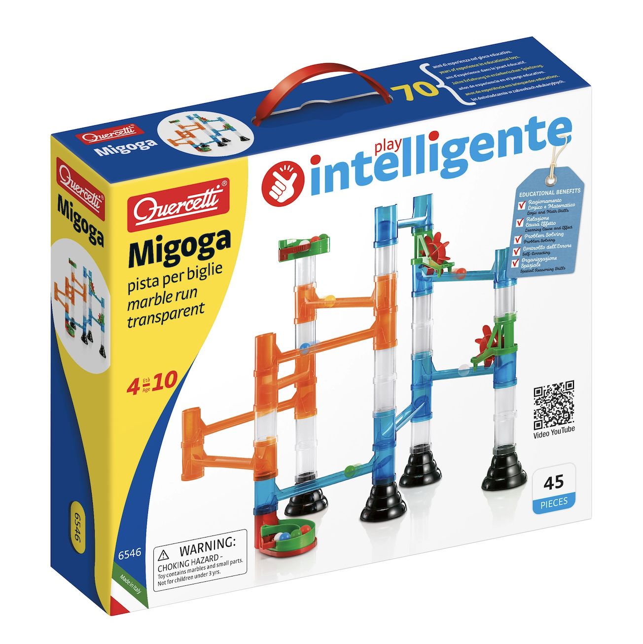 Assemble your own marble runs with this excitingly challenging construction set. Reproduce the layouts pictured on the box or have fun experimenting with new designs. Interlocking chutes, bridges, pillars, and spinning wheels can all be combined in countless configurations that guarantee hours of great fun. Migoga promotes creativity and logical reasoning both of which are required to place and fix the components precisely and get the marbles rolling. All pieces are made of unbreakable high-quality transparent materials so you can build solid structures and visually track the course of the marble. Ages 4+