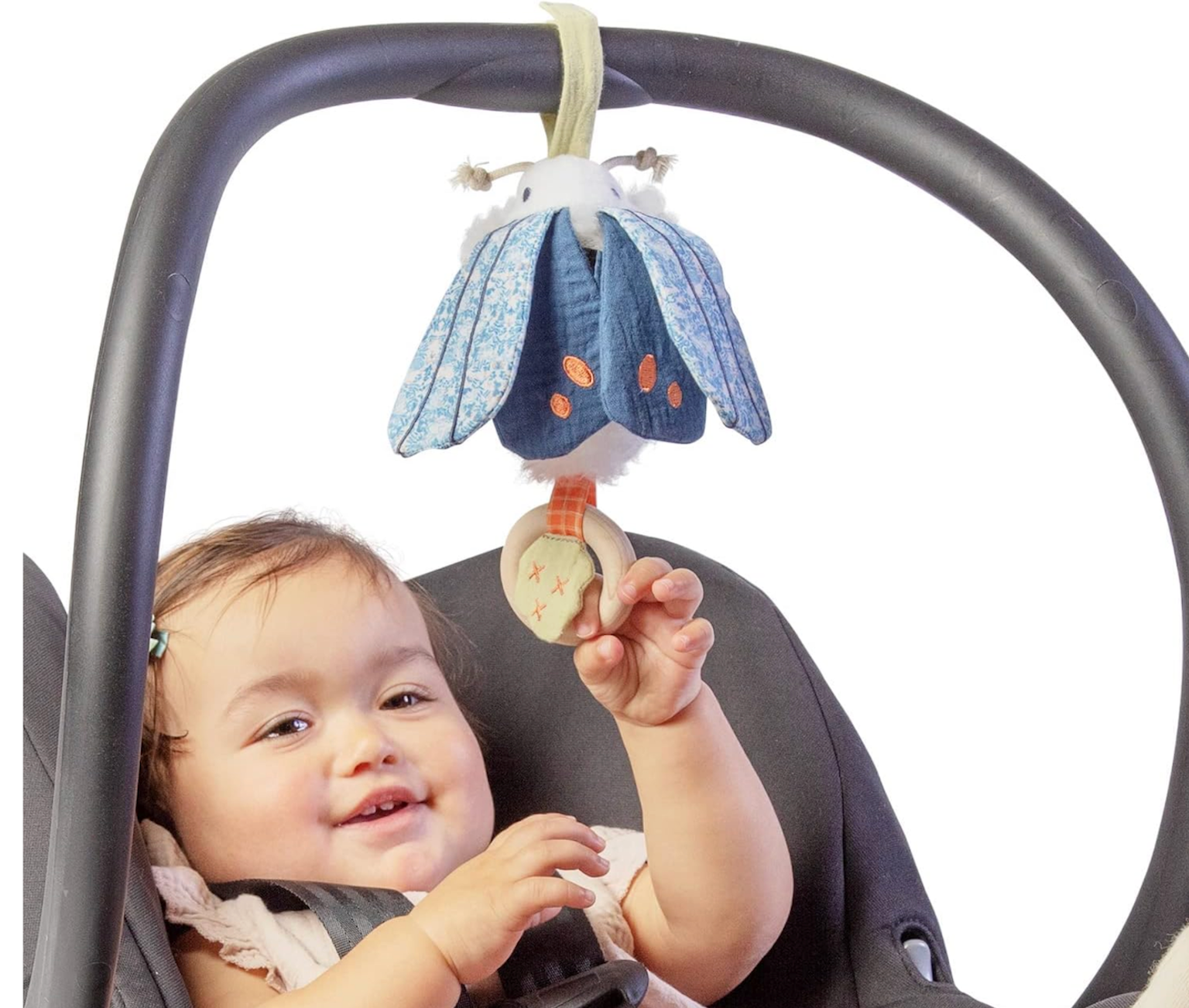 Folklore Luna moth toy features playful fabric textures that encourage sensory play, cause-and-effect learning, and self-discovery with the baby-safe mirror. The crinkle wings and leaf, along with a natural wood teether and interior rattle, are sure to delight. A fabric loop with hook-and-loop closure allows for attachment to carriers, strollers, play gyms, and more. Ages 0+