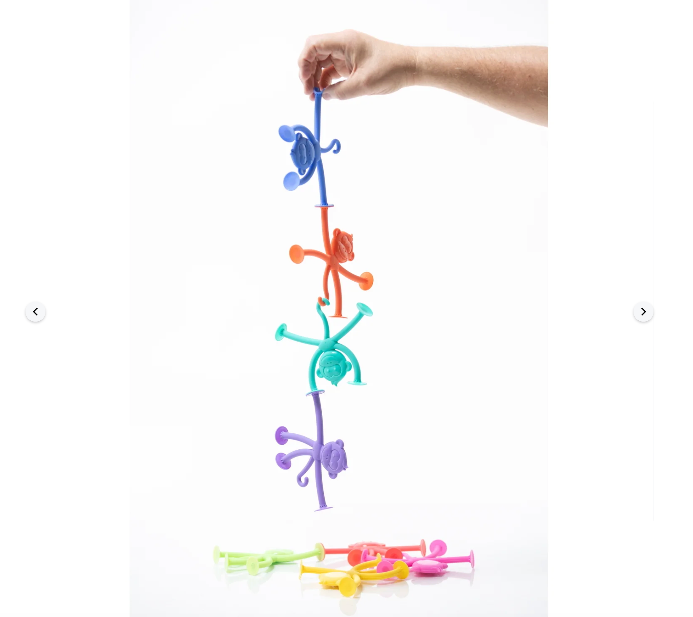 These stretchy little suckers love to stick to everything! Slap 'em on windows, counters, or even each other. Feeling adventurous? Stick 'em to your ceiling fan and watch the fun fly! They're the most fun you can have just hanging around! Comes with 6 different monkeys in vibrant colors and shapes. Made from food-grade silicone, they are perfect for trip to the park and even the bath! Easy to clean, dishwasher safe, and safe for teething. Ages 1 & up.