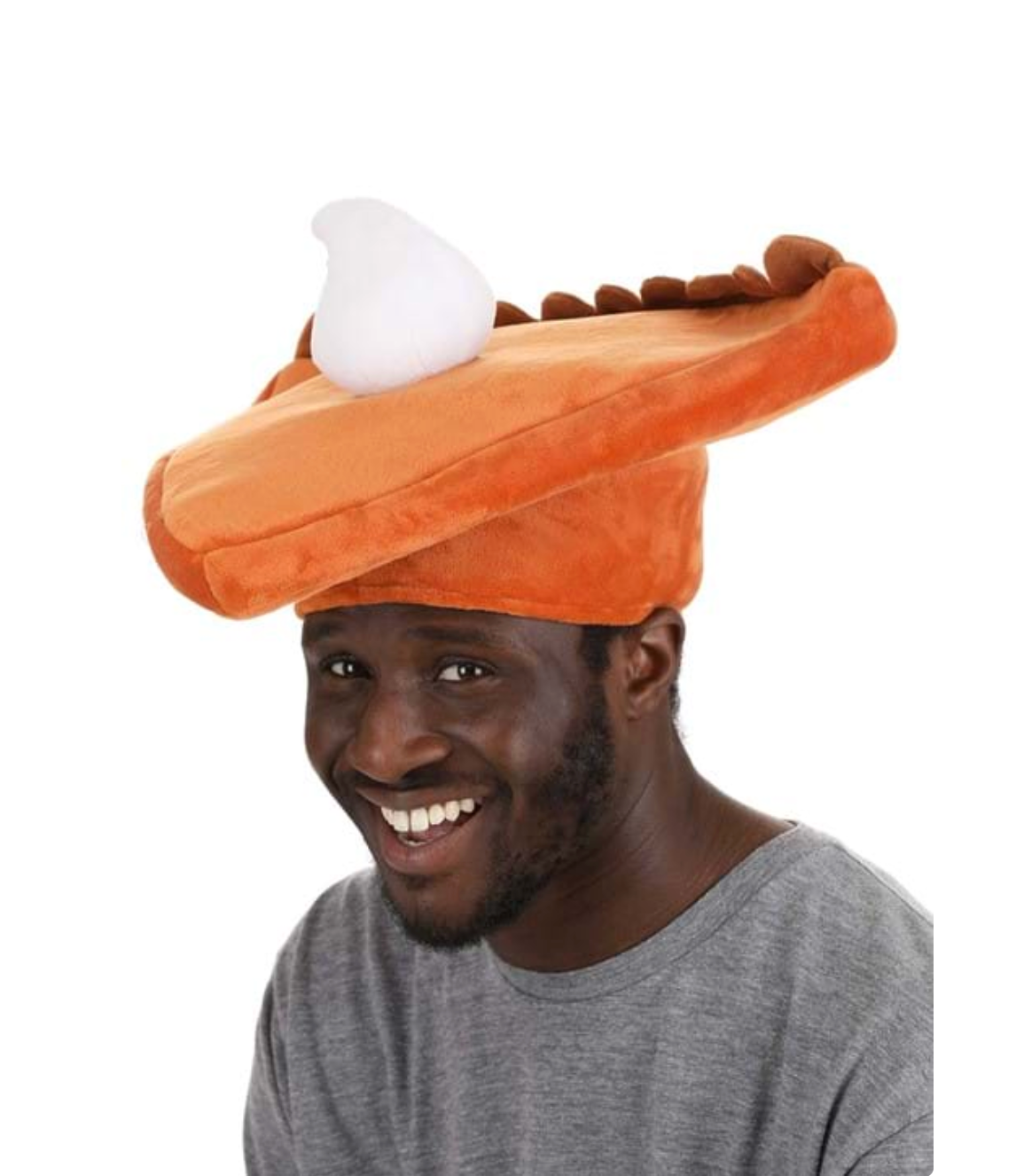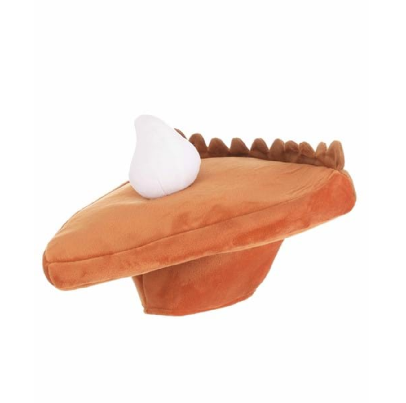 Show off your whimsical sense of humor and your love for nature's perfect food all at the same time! There's no such thing as too much pie, so wearing it while you eat it isn't overkill at all. In fact, it makes the perfect topping for your festive outfit. Made of soft orange velour, the hat is topped with a fiber-filled, pie-shaped wedge that's embellished with a ridge of brown fabric "pie crust." It's garnished with a dollop of soft-sculpted "whipped cream" made of white fabric. Elastic in back edge for snug fit. One size fits most adults.