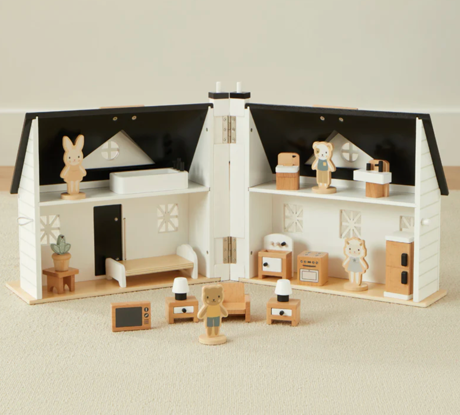 There's no place like home......Home Sweet Home Dollhouse, that is! Our carry along dollhouse opens it's doors to a ton of imaginary play! Comes with bathroom (tub, toilet, sink), bedroom (bed, nightstand, plant) living room (sofa, end tables with drawers that open, tv and 2 lamps) and kitchen (fridge, oven and sink), plus a furry family of 4 that can be removed from their stands. Folds up and has a built-in handle for easy transport. Home Sweet Home is where the heart is! Ages 3+.