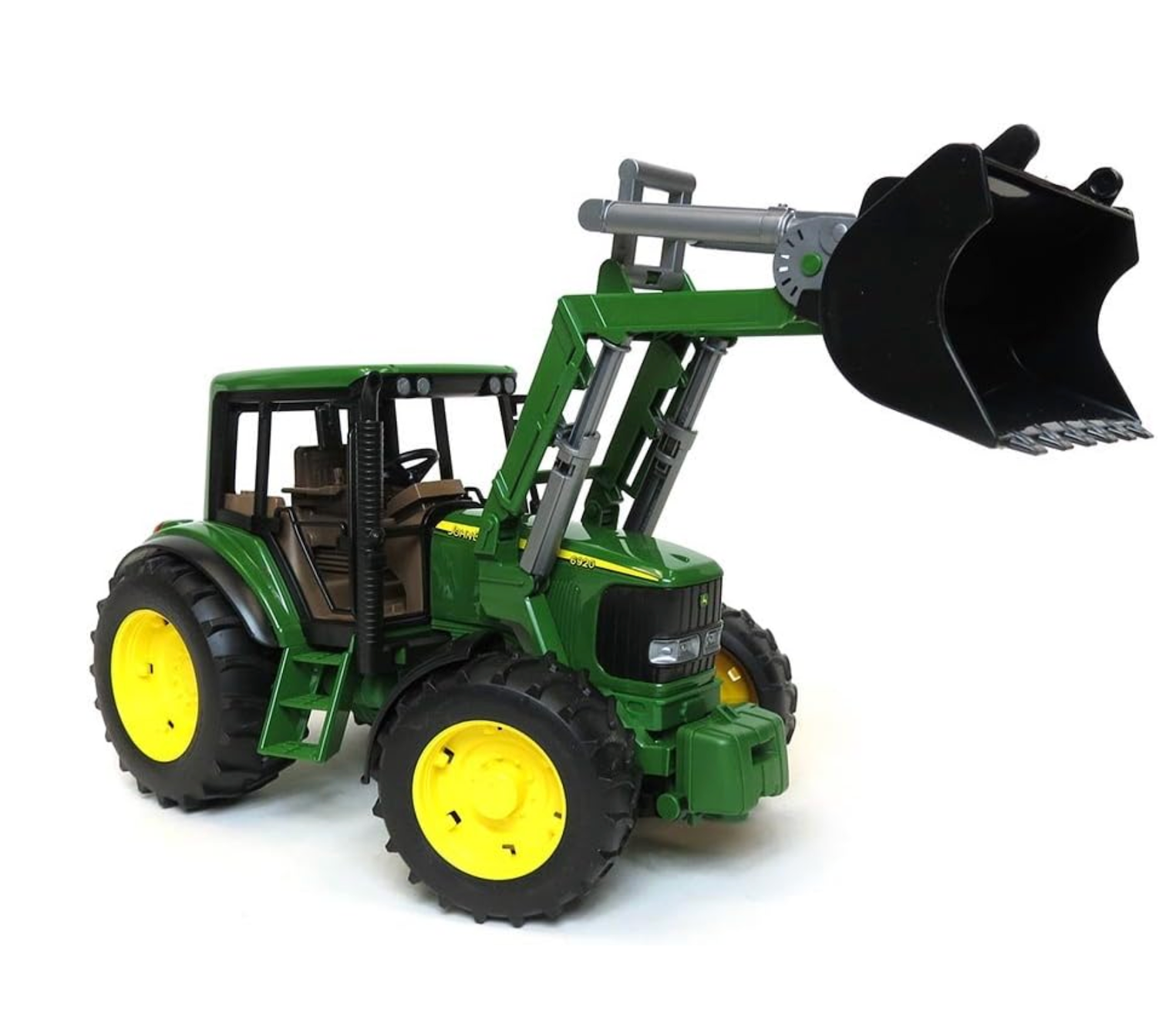 Bruder 16th scale tractor 6920 with front loader. Like all tractors in the Profi series, this true-to-original tractor can also be equipped with twin tires (not included). The all-terrain pendulum front axle can be steered either directly via the steering wheel in the driver's cab or via a supplied steering rod extension, which the children can attach to the steering wheel through the sliding roof in the driver's cab. The fully functional front loader can be attached and removed again simply by removing the front weight. The hood can be opened to reveal the engine block. Treaded tires complete the picture. Ages 3+.