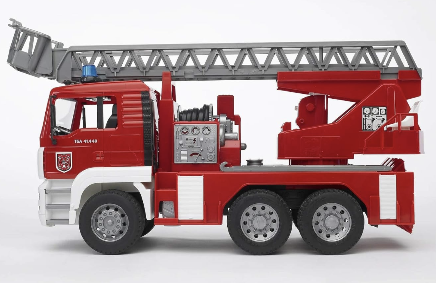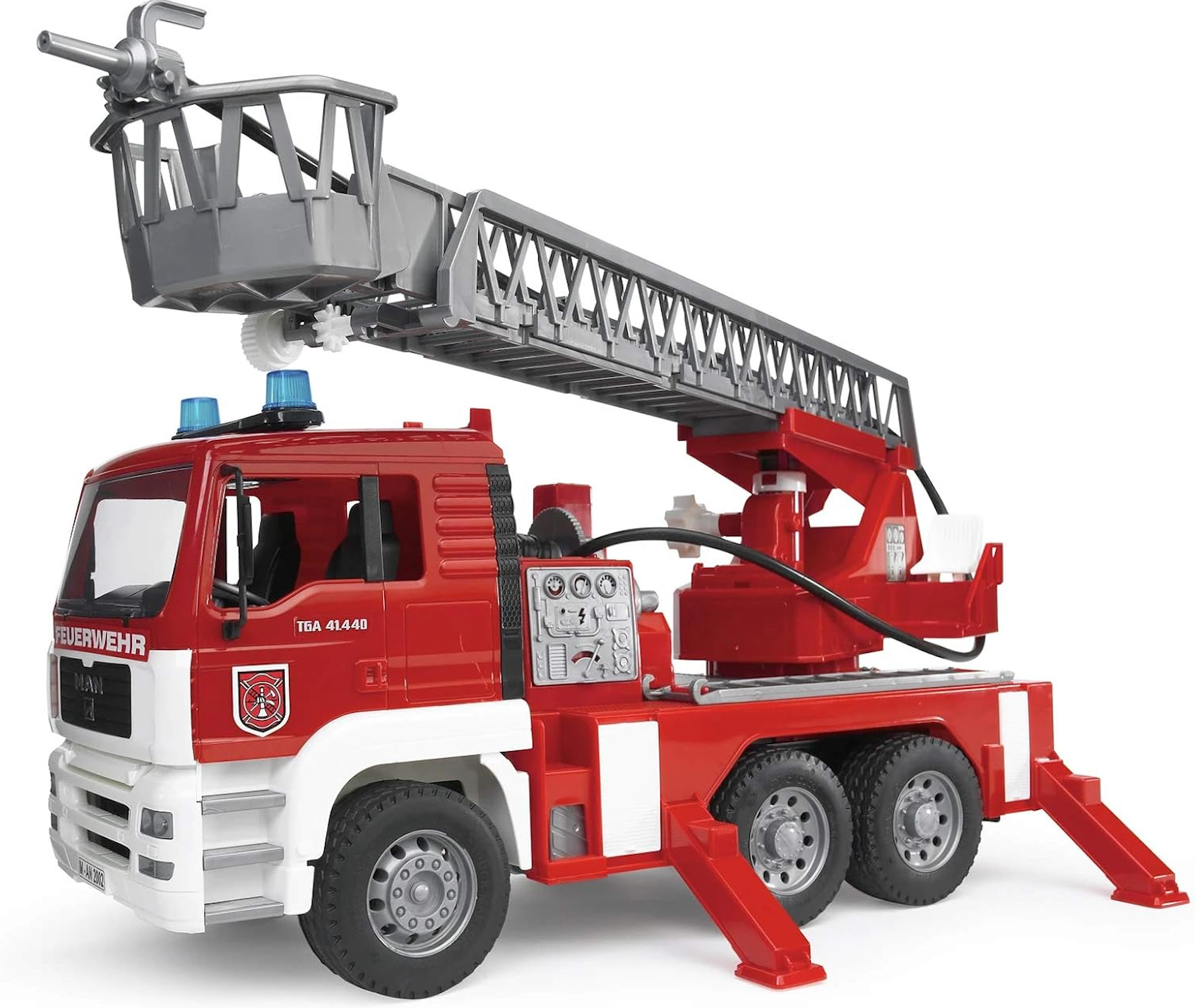 The water hose can be wound up and has a fully functional water sprayer at the end. The turntable ladder including rescue basket can be extended and the height can be adjusted using a handwheel. Ages 4+.