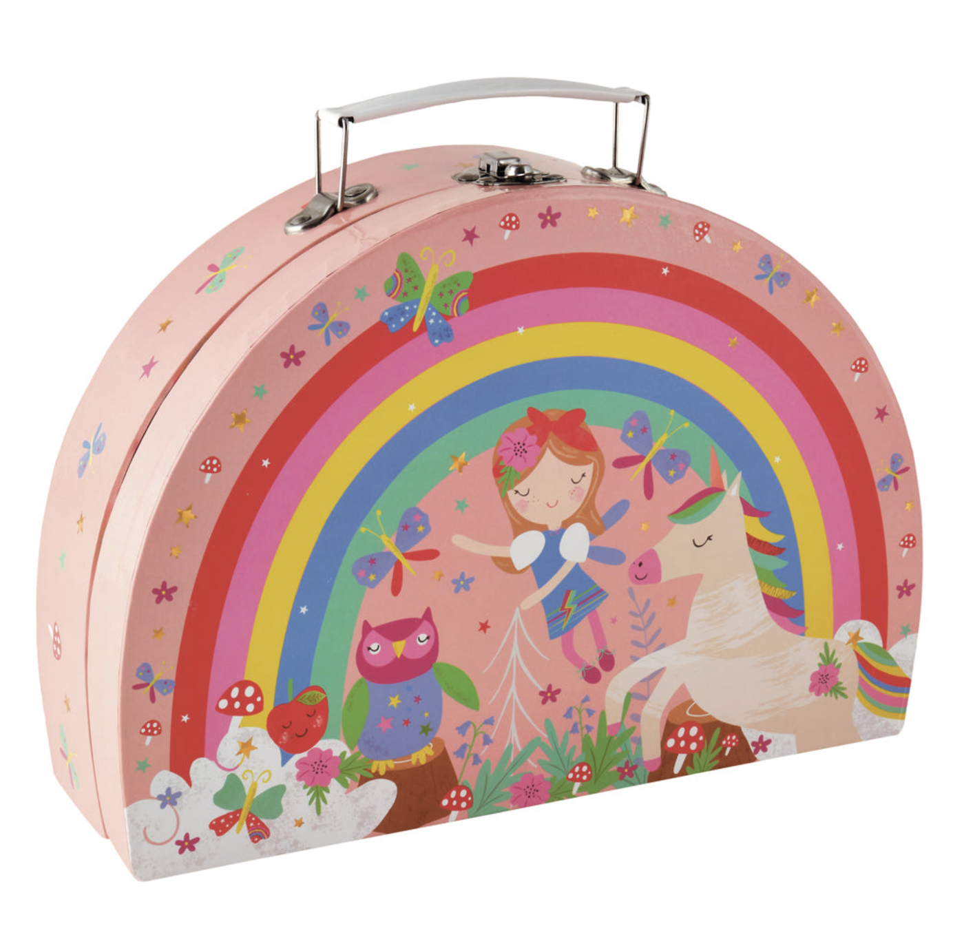 Have a tea party with the fairies and fun woodland animals supplied in a reusable-foiled rainbow shaped carry case this 10 piece tea set includes: 2 tea cups and saucers, 2 spoons, 2 plates and a lidded teapot. Ages 3+.