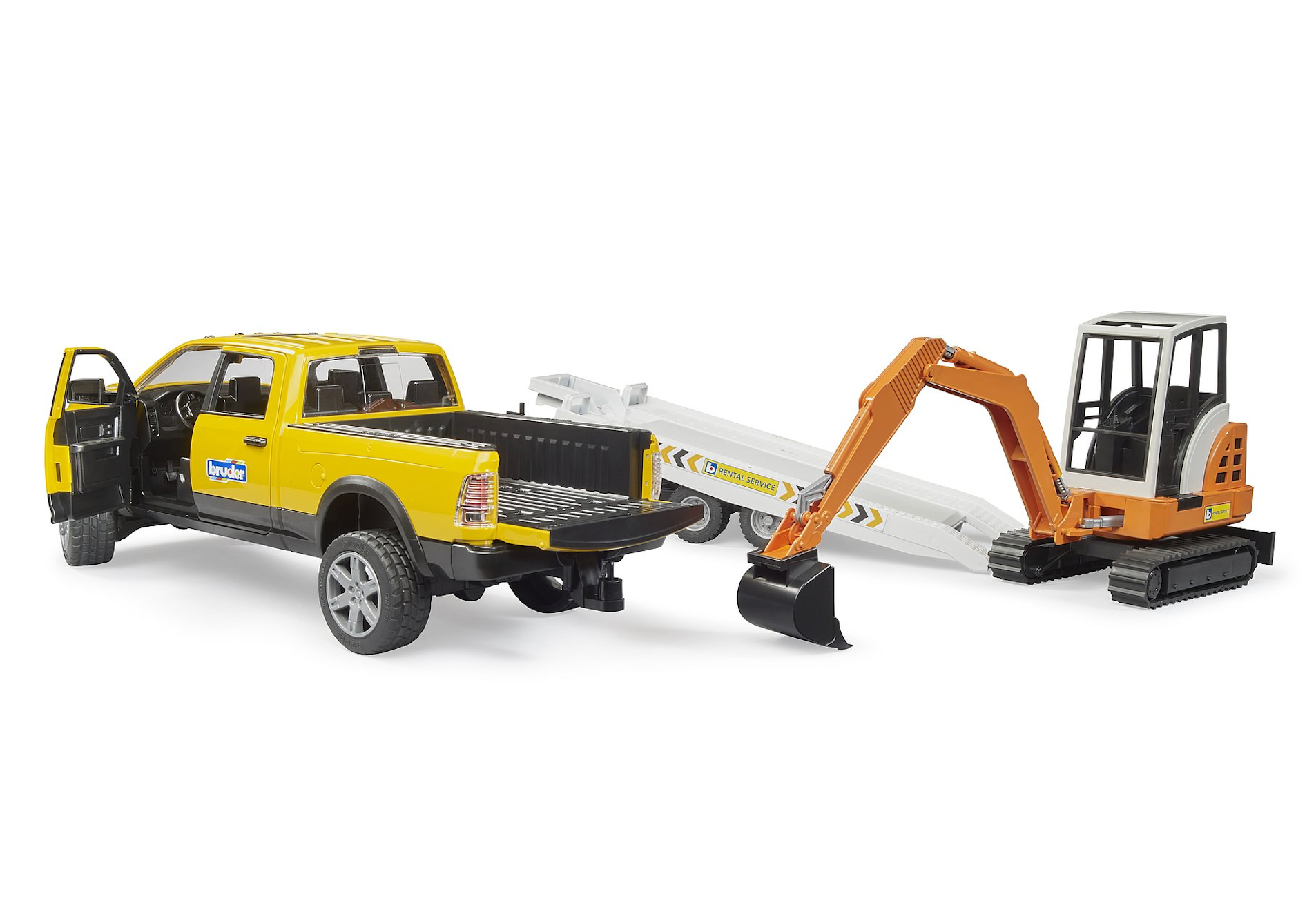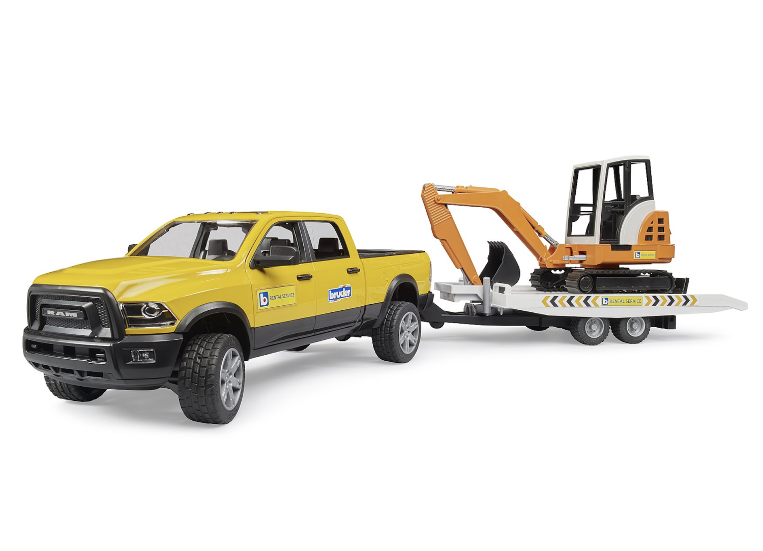 RAM Rental Service with Mini Excavator. This model at a scale of 1:16 features suspension on both axles to provide ride comfort and off-road capability. The tailgate opens to transport loads and the loading area provides space for Bruder pallets, pallet cages or straw bales. The included trailer has a support for the tailgate and the platform can be tilted via a lever for easy loading. The included BRUDER mini excavator is fully functional, the bucket is detachable and the plough blade is adjustable. The mini excavator boom can be angled sideways. In addition, the mini excavator’s cab can be rotated 360° and it is supplied with modern rubber tracks. Ages 4+.