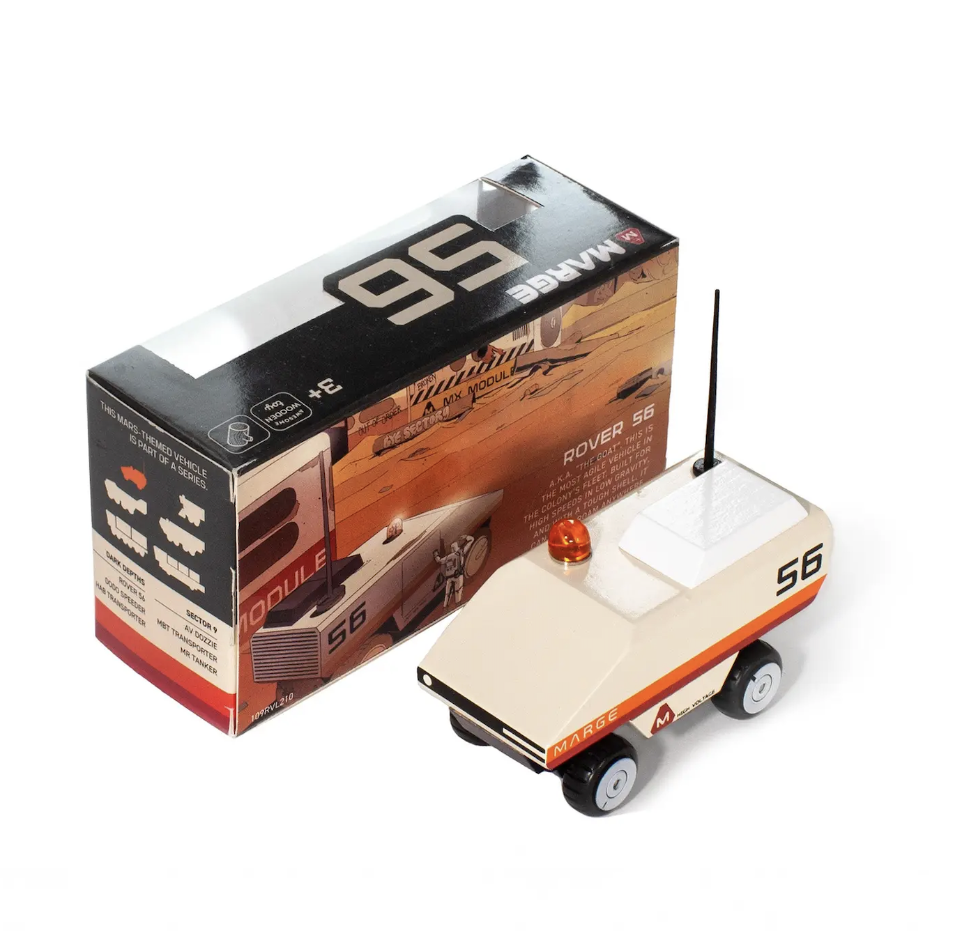 The Mars Agency for Research + Geographical Exploration (M.A.R.G.E.) proudly presents the Rover 56, a meticulously designed Mars rover equipped with an advanced suspension system to adeptly navigate the challenging terrains of the red planet. Crafted with the highest-quality beech wood available, ensuring durability and longevity for all space missions. Solid Beech Wood finished with non-toxic, water-based paint. Rolling chassis is a diecast alloy base and ABS plastic wheels. Ages 3+.