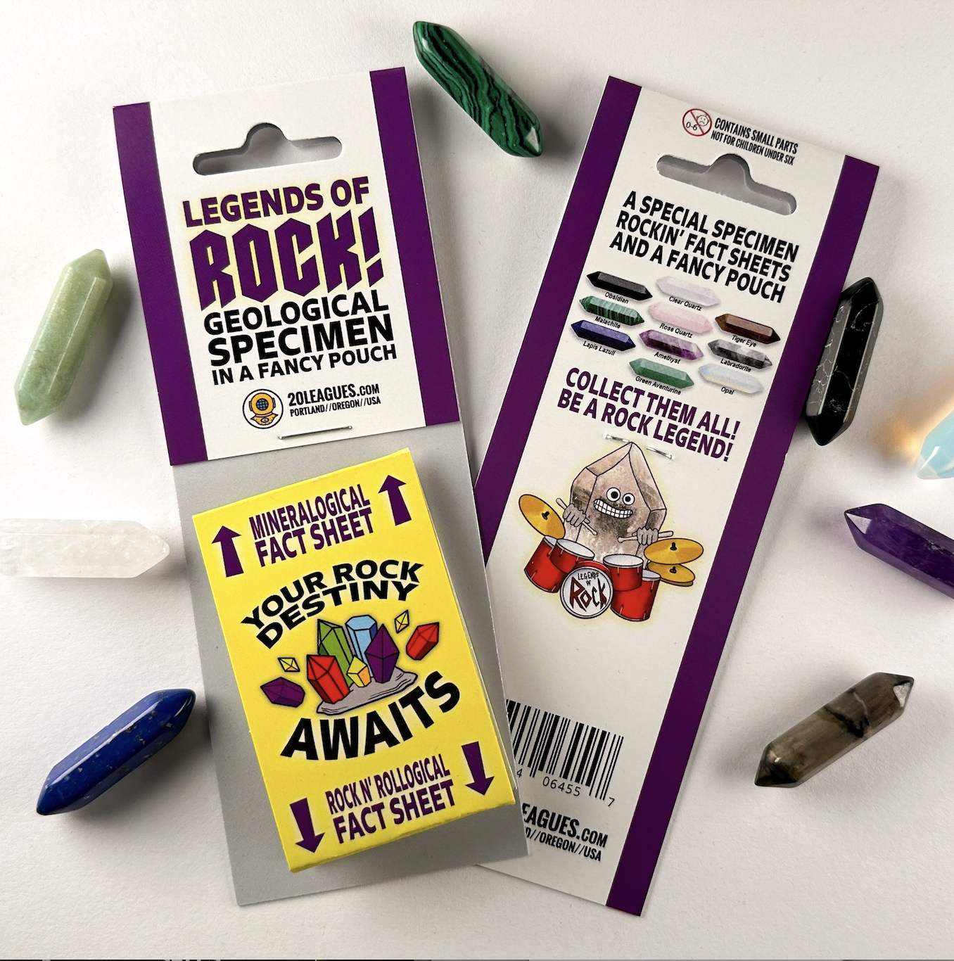 Each Legends of Rock! package includes a geological specimen, a fancy pouch, and a Mineralogical & Rock n' Rollogical fact sheet! Part science, part silly. Blind box style product encourages customers to collect them all. Ages 6+.