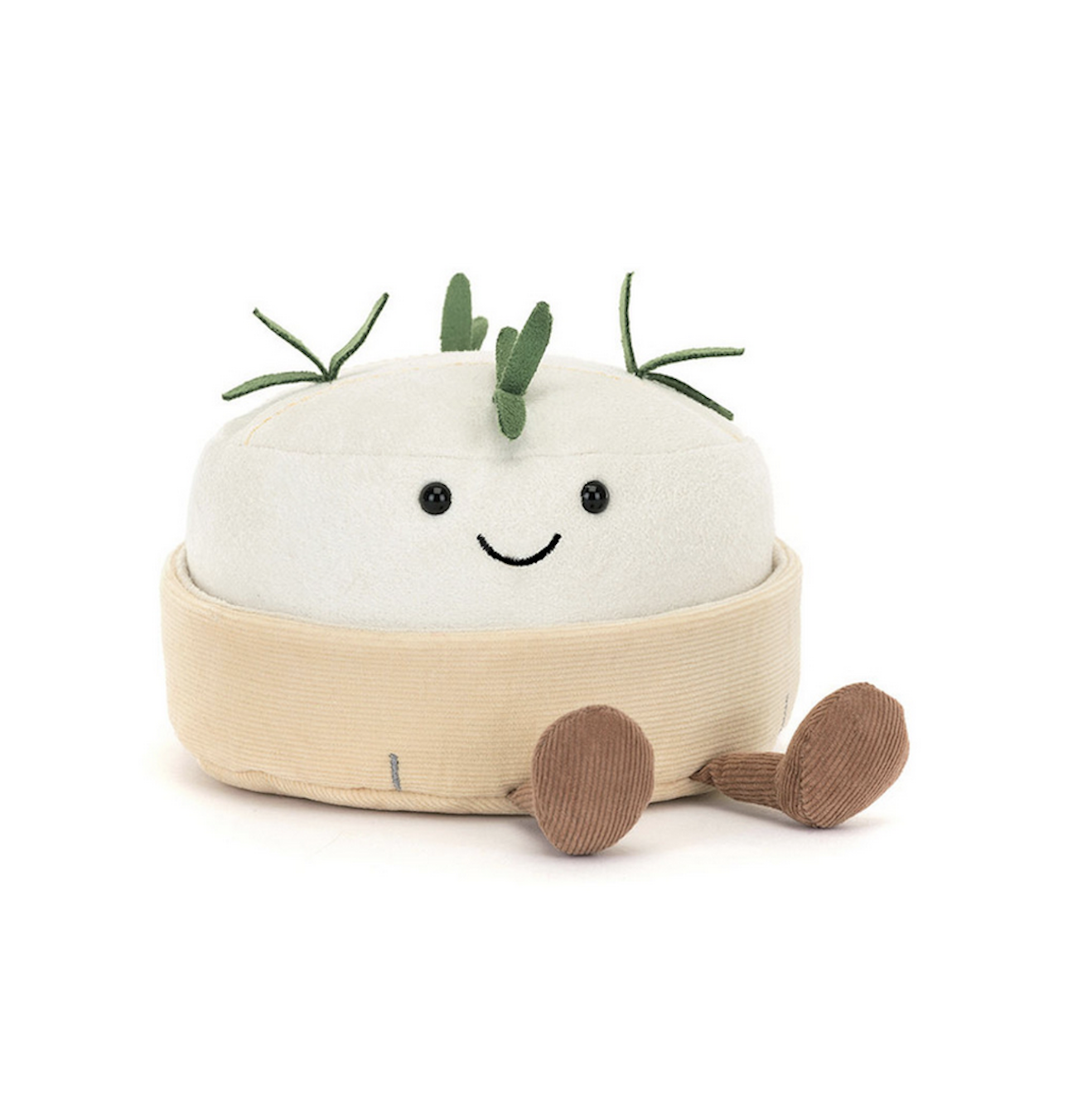 ***Maximum of 2 per customer. Amuseables Camembert is here to spread cheesy joy. This cream suedette cheese has stitched rind detail, and is topped with sprigs of suedette rosemary. Nestled in its fine cord container with staple detail, this smiling cheese can be taken out of its box for foodie hugs. The perfect gift for any foodie friend. Sitting Height 3in. Suitable from birth.