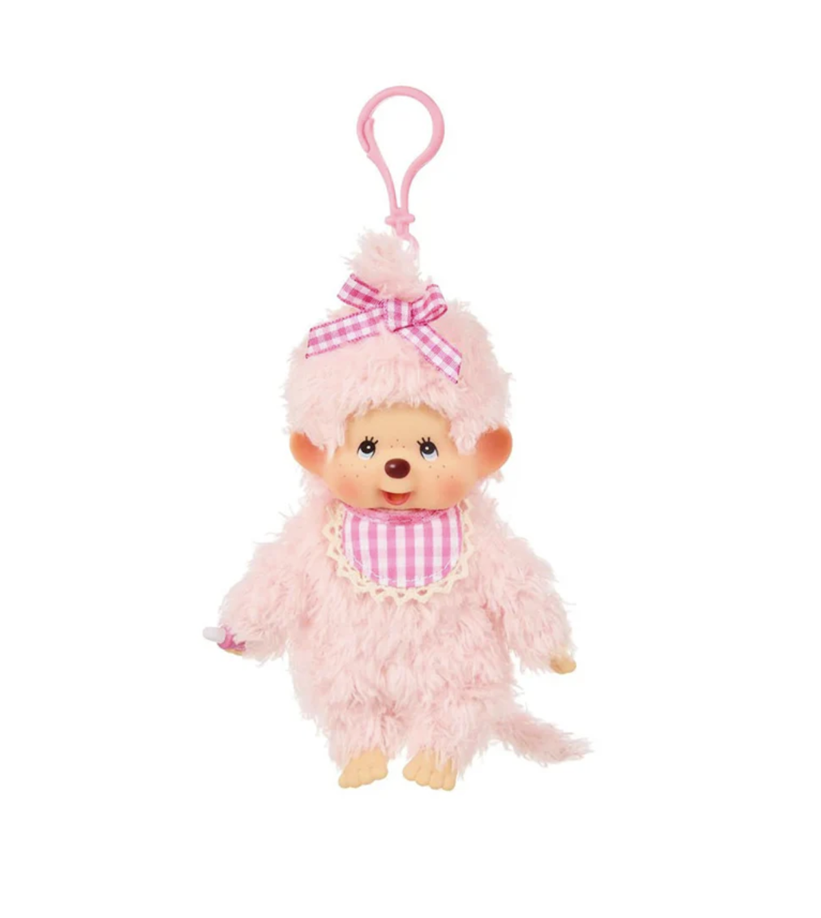 This adorable Monchhichi girl features irresistibly soft pink fluffy fur and comes dressed in a charming pink gingham bib trimmed with delicate lace and a matching bow. She's complete with her signature pacifier, making her instantly recognizable and utterly lovable. Compact and lightweight, she's the perfect size to clip onto your keychain, backpack, or purse for a touch of kawaii charm wherever you go. Whether you're a longtime Monchhichi fan or discovering these cuties for the first time, this plush accessory brings playful nostalgia and sweetness to your everyday adventures. Measures about 3" wide x 5" tall. Ages 3+
