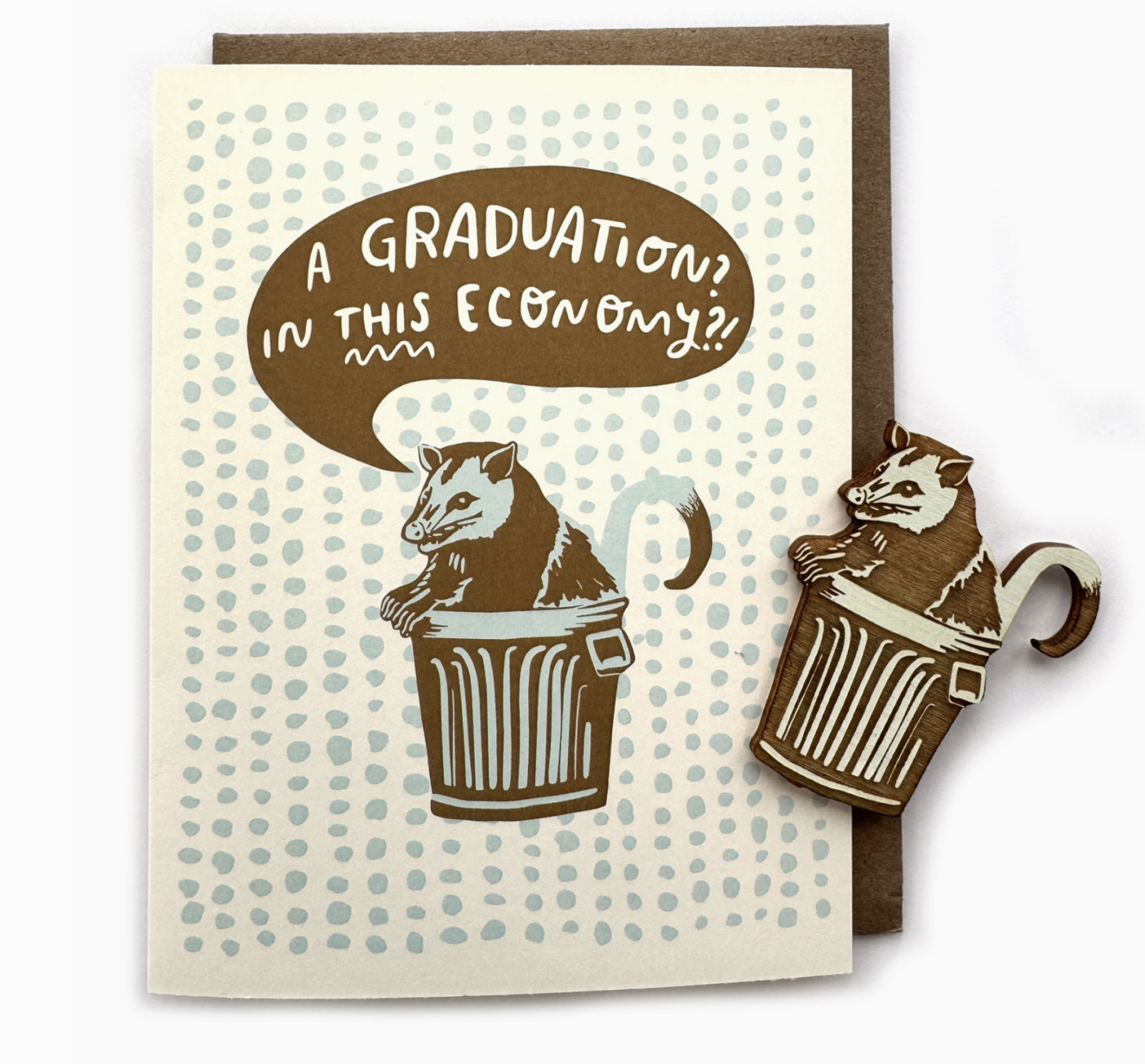 The economy is in the dumps but that doesn't mean we get to stop celebrating graduations. The laser-engraved possum magnet affixed to the front of this greeting card is meant to be removed and kept forever. The paper, envelope (and cellophane packaging) should be recycled or composted, because our possum friend doesn't have room in his tiny trash can. Magnet is hand painted 1/8" baltic birch plywood. Super strong rare earth magnet. Blank inside. Requires extra postage.