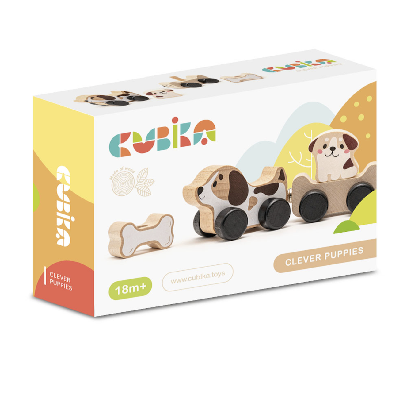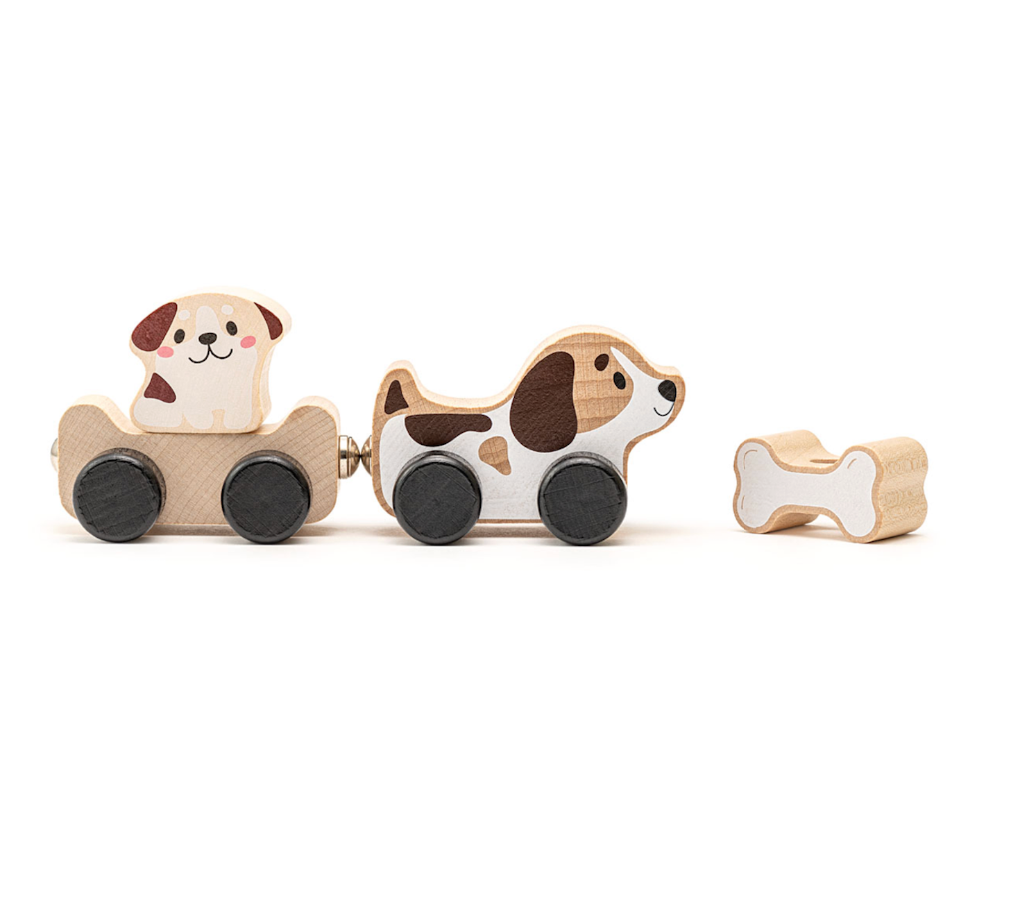 This wooden train features rolling dogs and a magnetic trailer with a bone, providing a fun and interactive play experience for toddlers. Made from 100% organic wood from sustainably managed forests in the Carpathians Mountains. Produced with German water-based organic paints and ideally polished. Ages 18M+.