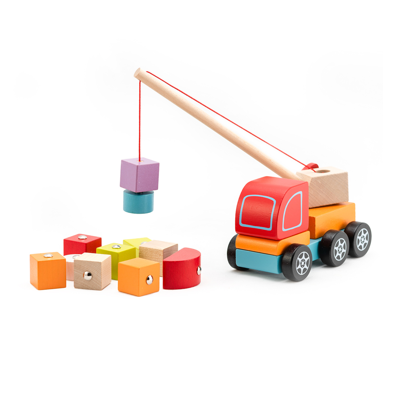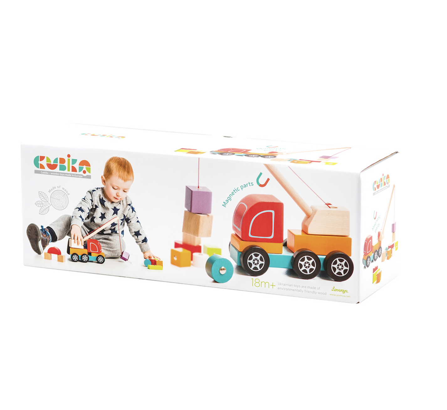 Consists of fourteen elements which include wooden colored cubes with magnets. The crane rotates the wheels and rolls on any surface. The crane itself is assembled from four elements. The kit includes a tower with a magnetic crane, as well as ten game pieces of cargo. Made from 100% organic wood from sustainably managed forests in the Carpathians Mountains. Produced with German water-based organic paints and ideally polished. Ages 3+