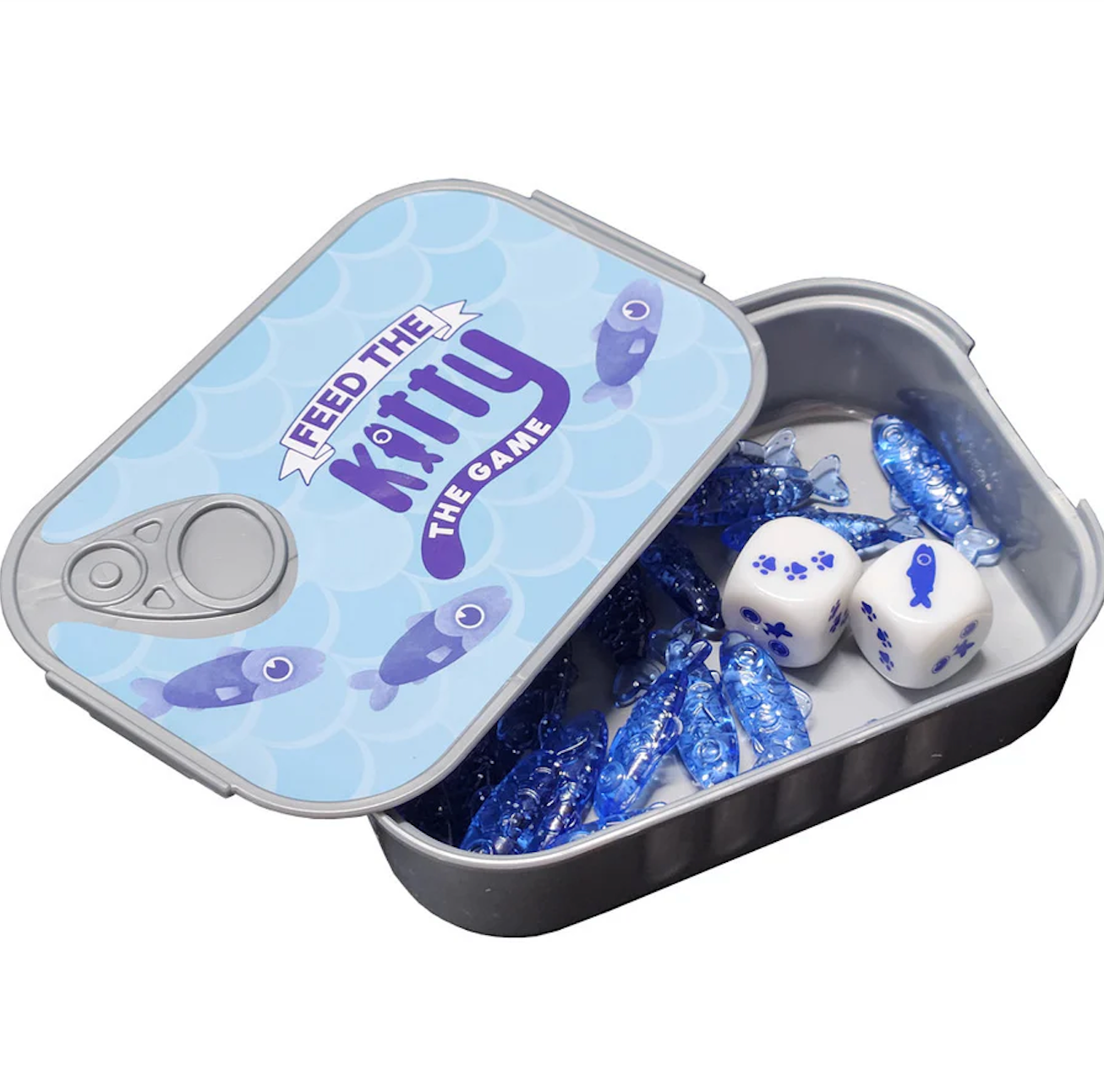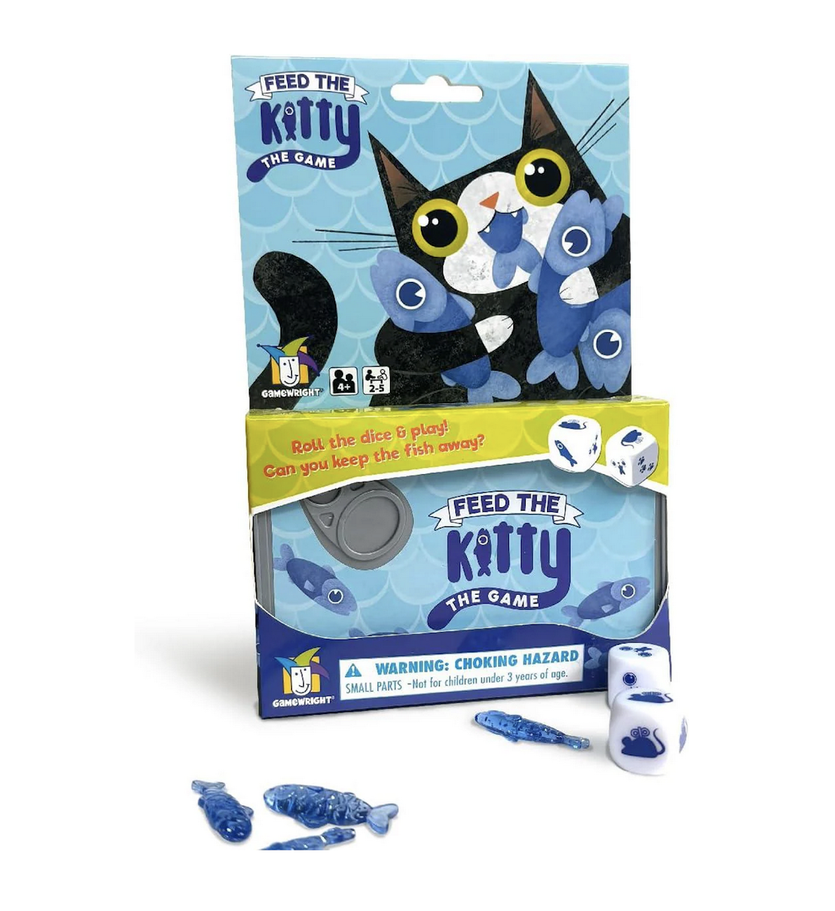 Feed the Kitty is a fun and fast dice game that’s easy to learn and impossible to put down! Roll the dice and play, can you keep the fish away? Roll the dice and either feed the kitty, pass the sardines to your left, or take a sardine from the tin. If you run out of sardines, you’re out of the game! Easy to teach and quick to learn. Great for 2-5 players ages 4 and up.