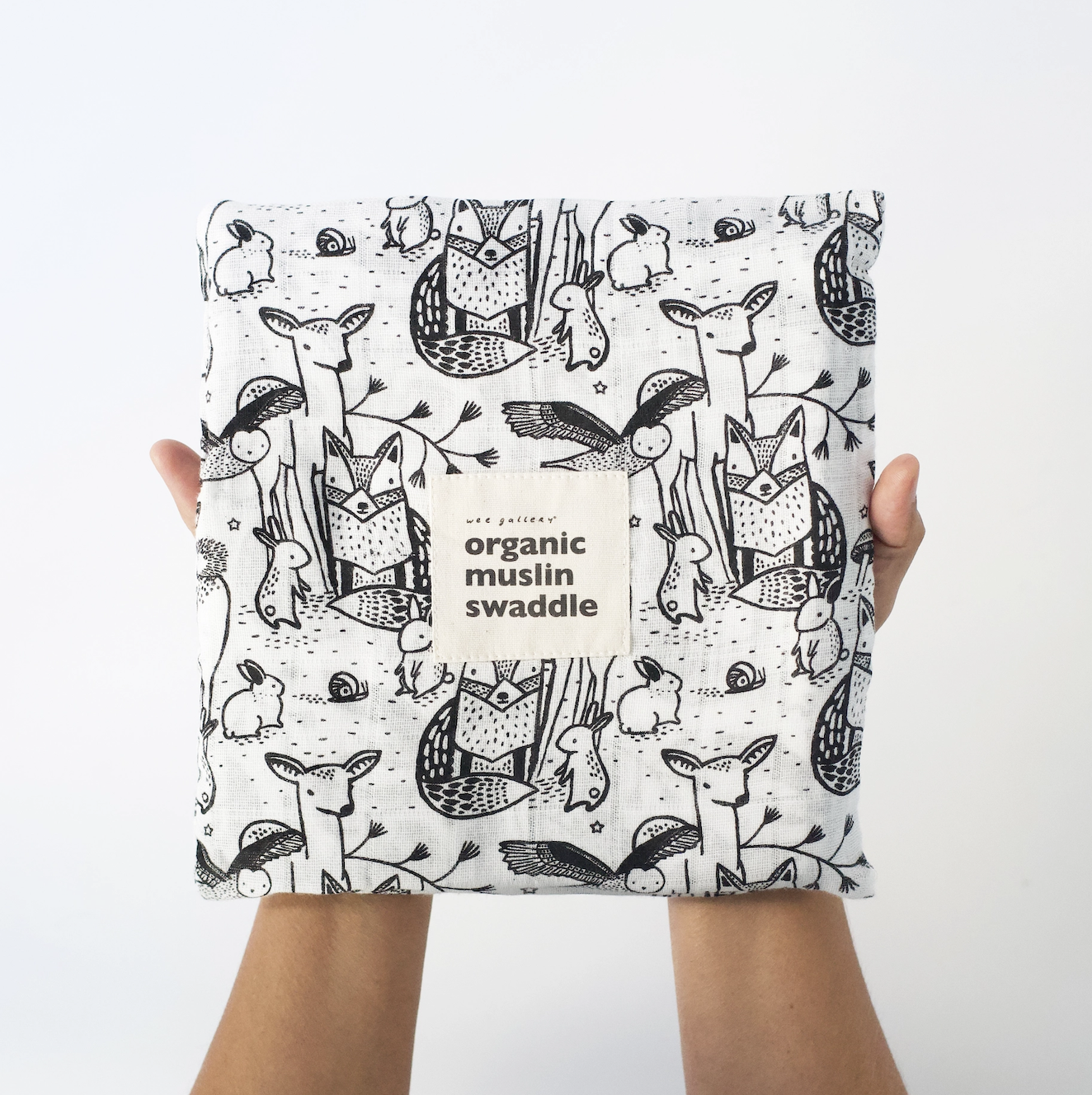 Our eco-friendly organic muslin Swaddles make baby, mom, and planet happy! These soft baby wraps are generously sized to be versatile enough as a swaddle blanket or stroller cover, and in the car seat, crib or changing table. Made in India using organic fabric and sustainable practices. Sure to become your go-to baby gift because of its lovely packaging and high quality. Baby will love looking at the hand illustrated high-contrast woodland/forest animals pattern, and snuggling in the soft organic cotton. Each blanket measures 48x48 inches. Made of" Organic Cotton Muslin.