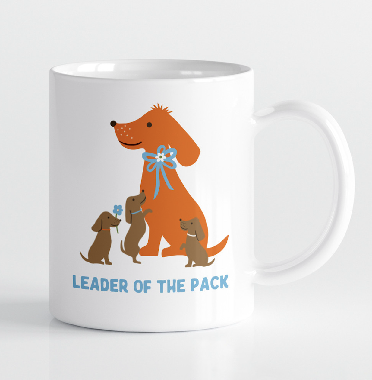 White ceramic mug with colorful graphics featuring a momma dog wearing a blue bow around her neck, with three puppies frolicking at her feet. That reads "Leader of the Pack". Dishwasher & Microwave Safe. Holds 11 ounces.