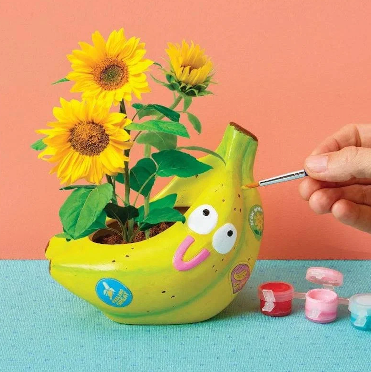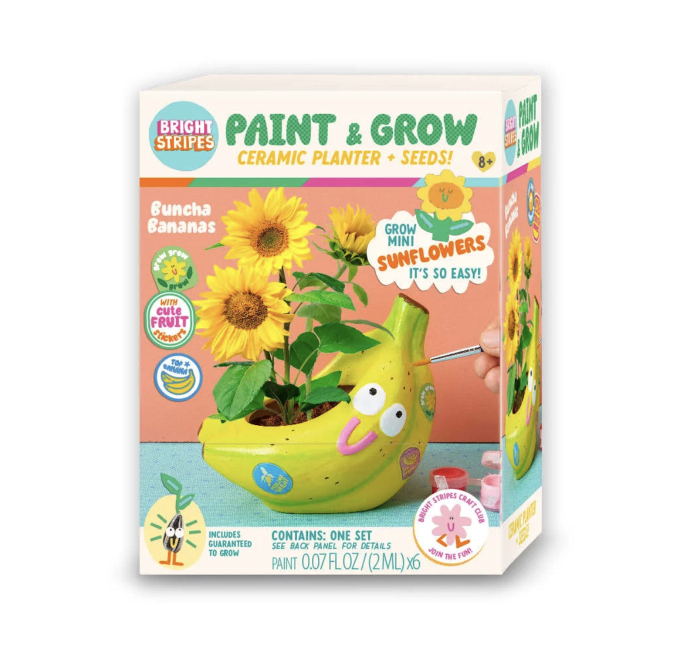 The Paint and Grow Go Bananas kit allows kids to use their paint brush and green thumb at the same time! It’s a painting set and gardening activity all in one! Paint a high-quality ceramic vase shaped as a Silly Banana character! Use the included paint brush and 6 high gloss paint colors and funny fruit stickers to decorate. Add the growing medium into the vase, pour in water and watch the soil expand like magic! Plant your real Mini Sunflower seeds! These seeds from our friends at Buzzy are guaranteed to grow. Ages 8+.