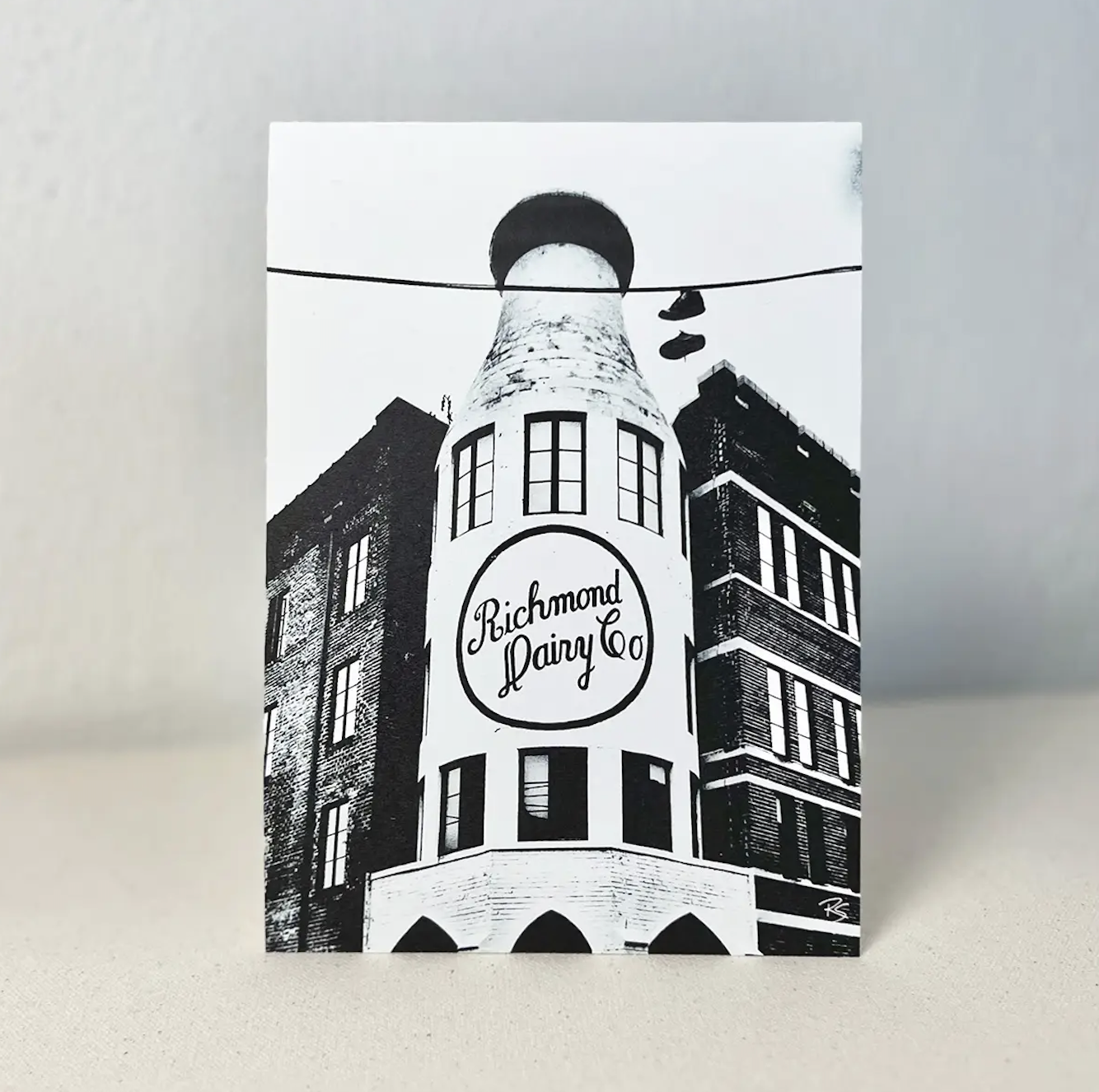 RVA Dairy is a photograph of the famous Richmond Dairy (Milk Bottle Building) in the Jackson Ward Neighborhood of Richmond, VA. This iconic building was the birthplace of the art/metal band GWAR and a symbol of Richmond's creative class. 8 x 10". Printed on 100% recycled card stock. Art by Renée Stramel.