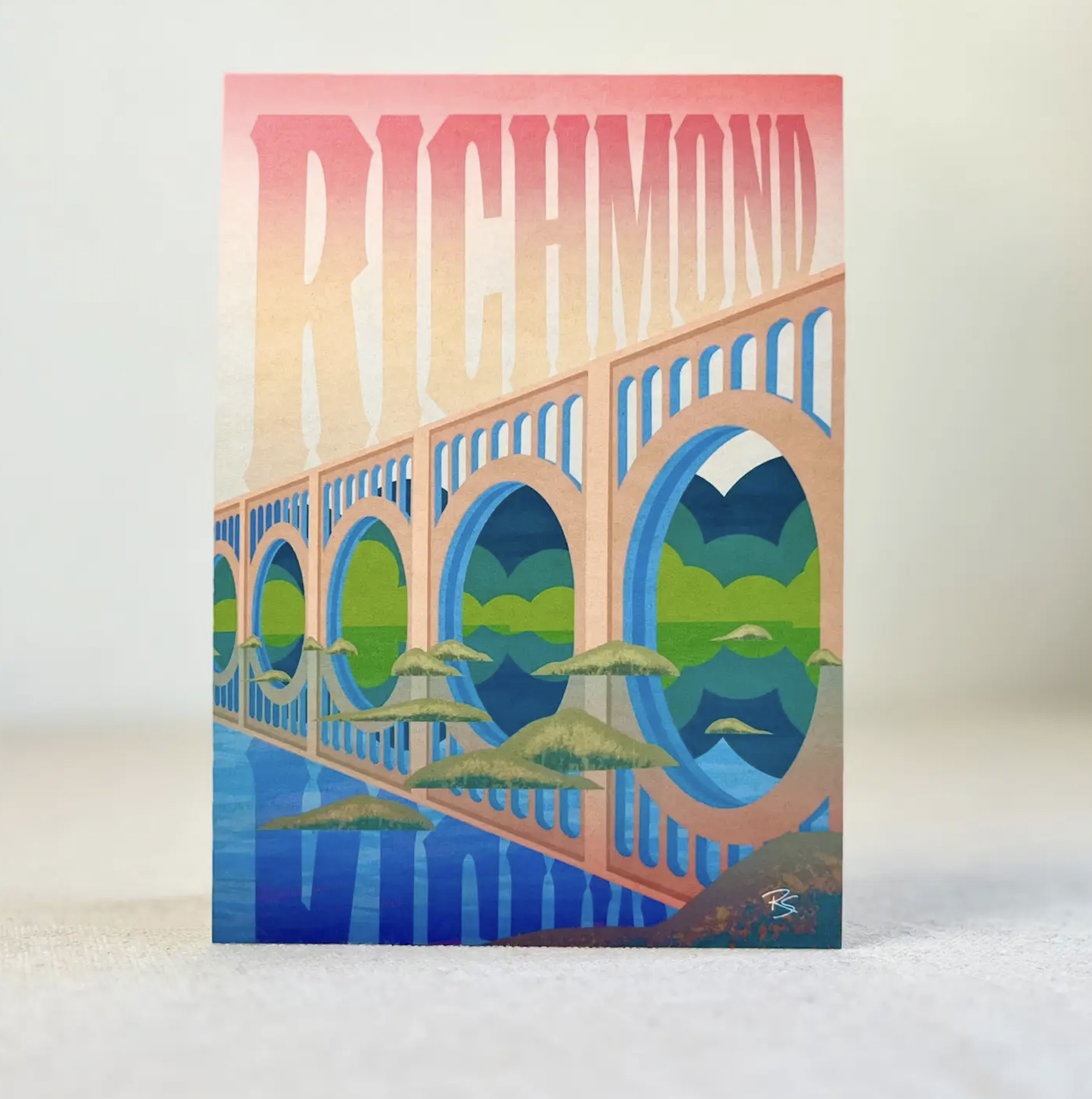 This digital painting of the famous Richmond Train Bridge is sure to stand out to Richmond fans and tourists alike. 5x7" Art Print. Printed on 100% recycled card stock. Artwork by Renée Stramel.