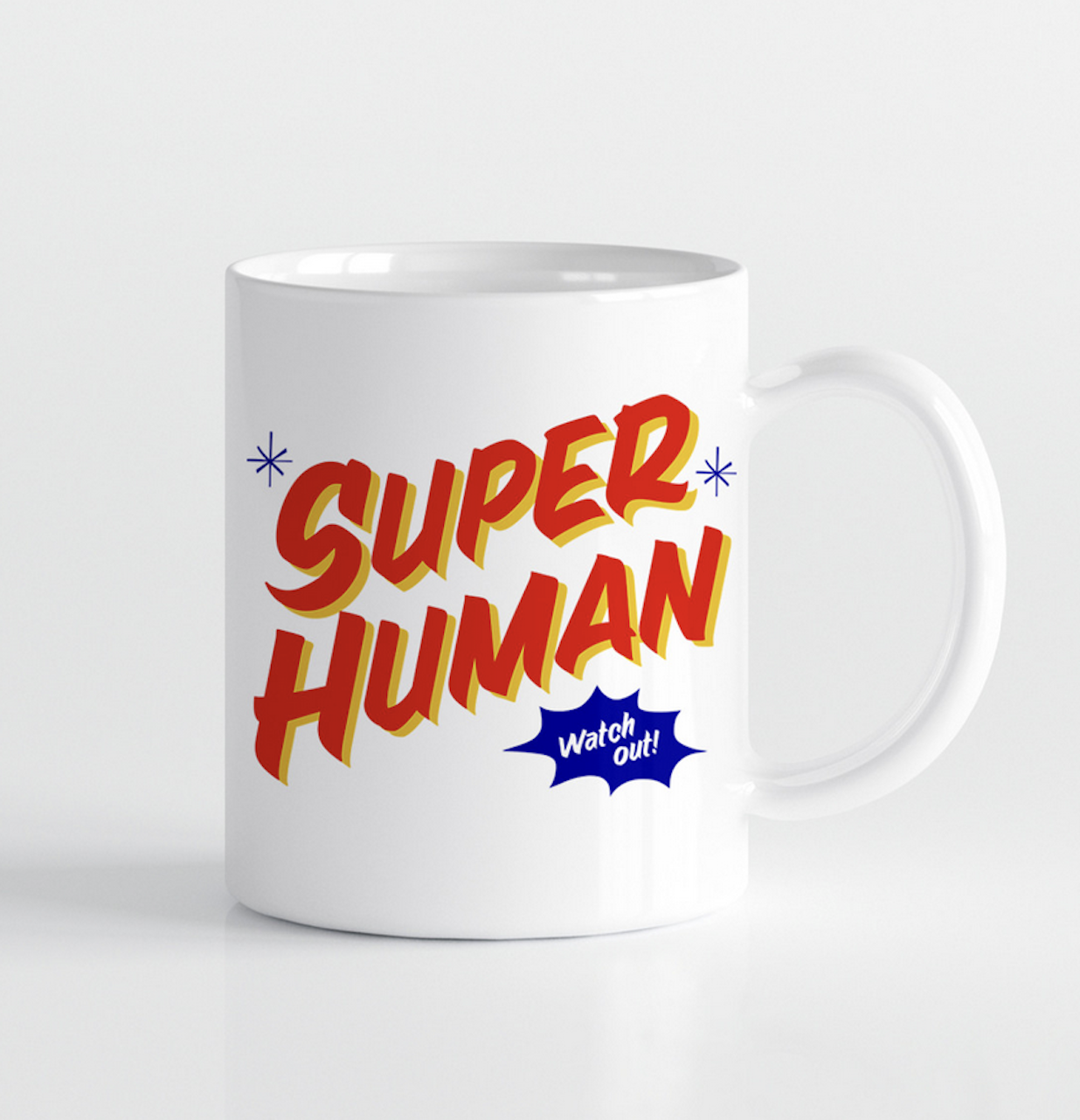 White ceramic mug with colorful graphics that read "Super Human Watch Out" in sign painter graphics style. Dishwasher & Microwave Safe. Holds 11 ounces.