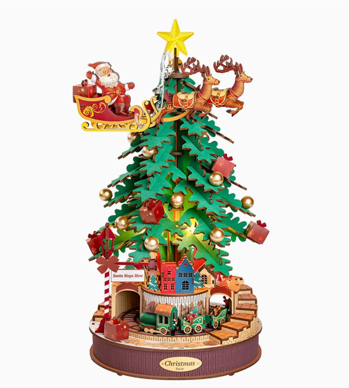 Rolife brings the magic of the holidays to life with the Christmas Melody Tree, a christmas tree crafts kit, an engaging holiday decor, and a rotating music box all in one! Assembled size 11.8x11.8x15.7". Ages 14+
