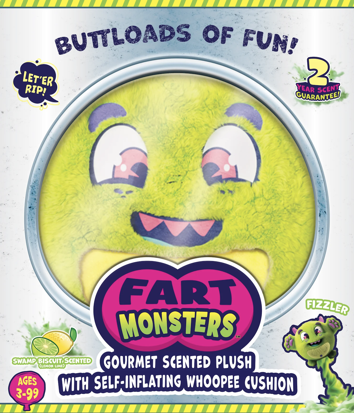 Fizzler the Fart Monster is a lemon lime scented plush toy that lets out a playful "toot" when squeezed. These mischievous plush buddies are on a mission to blast boredom away with every whoopie-powered toot. Each Fart Monster is stuffed with soft plush and a built-in, self-inflating whoopee cushion that lets out a real fart sound when you sit, squeeze, or squish 'em. Perfect for pranksters, Fart Monsters bring laughter, surprise, and a little aroma to playtime. Ages 3+