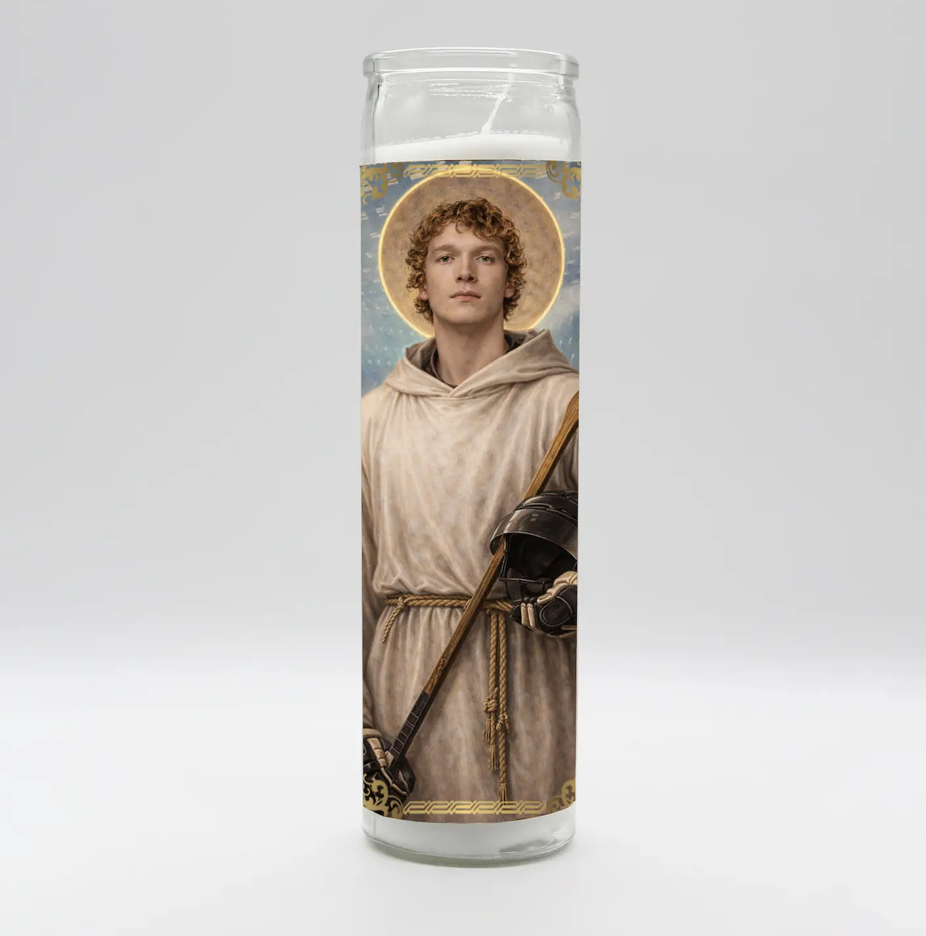 Connor Storrie in Heated Rivalry as Ilya Rozanov inspired parody art prayer candle. Tall white candle, hand poured in Mexico, design and assembled in the USA. Candle is unscented.