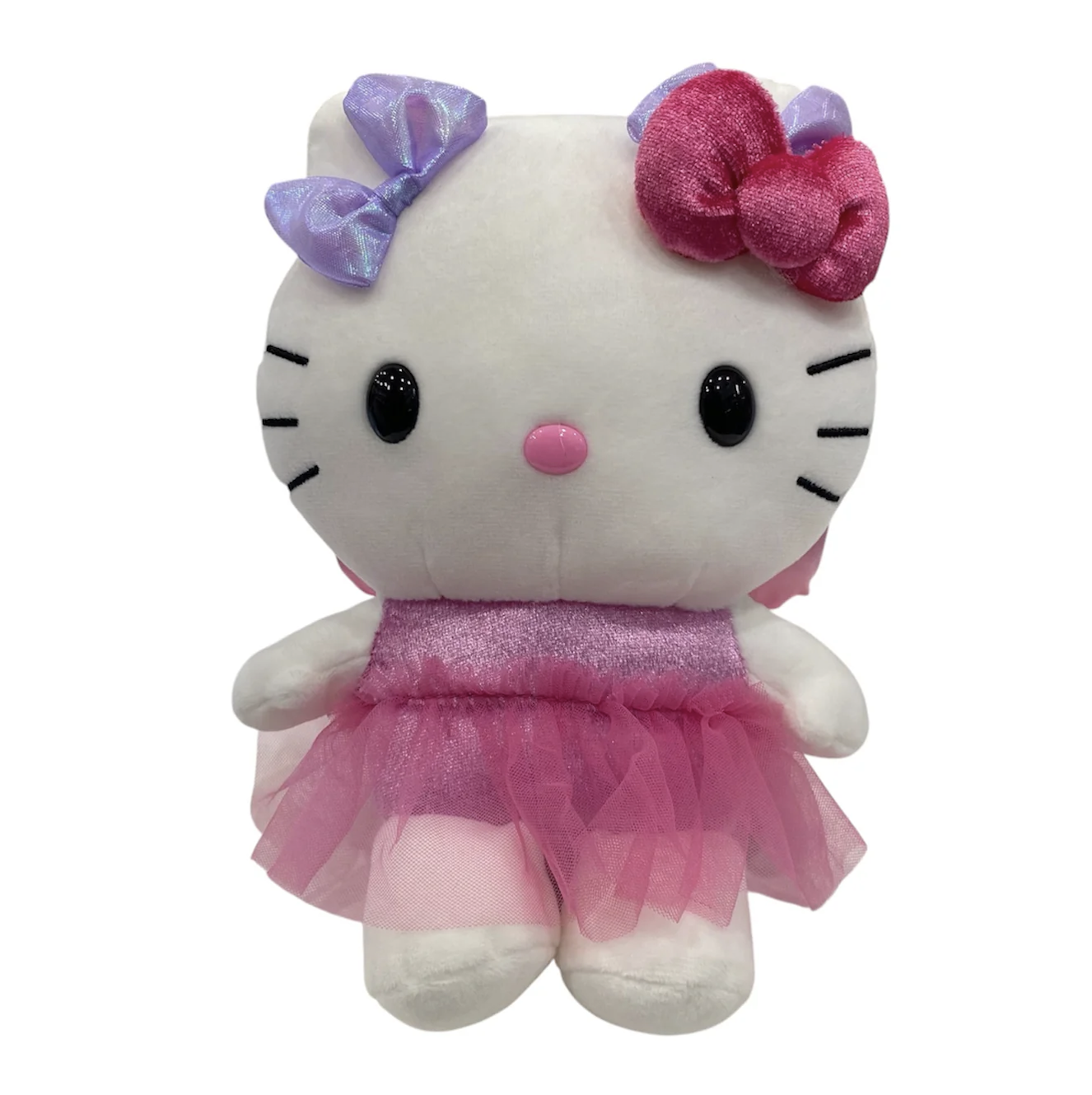 A plushie so sweet and ready to spread kindness on this Valentine’s Day! Hello Kitty is dressed as a little "love bug" butterfly with pink wings with pink and white hearts all over them, along with a pink tutu and iridescent bows at each ear. Ages 3+
