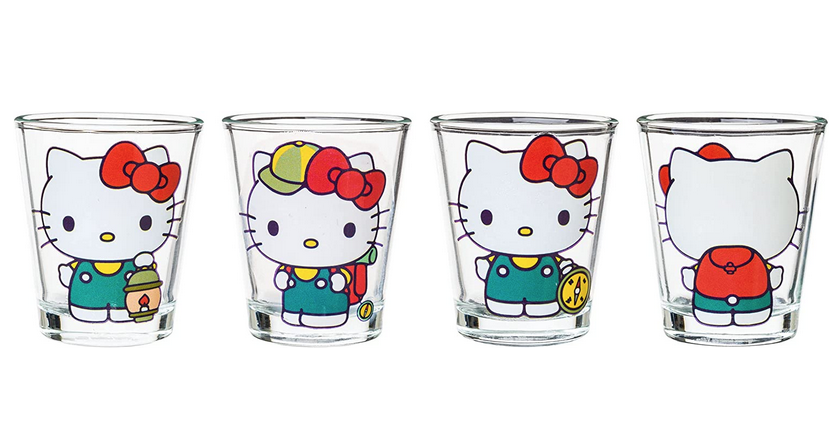 Express your love for Hello Kitty with this mini glass set. This 4-pack of mini glasses holds approximately 1.5-Ounces of liquid by each. Top Rack Dishwasher Safe - do not use cleaners containing bleach or chlorine. Do not use in microwave.