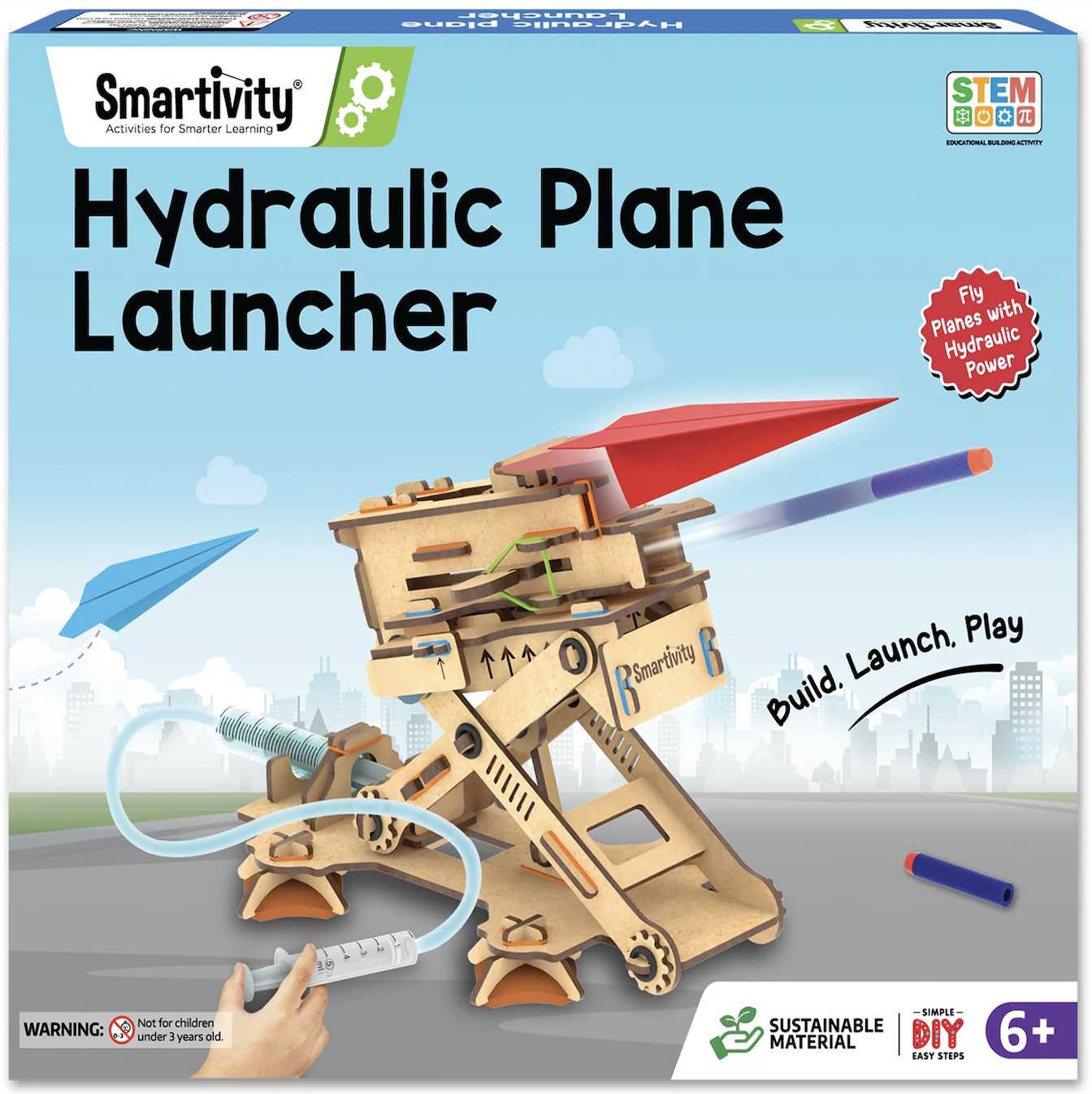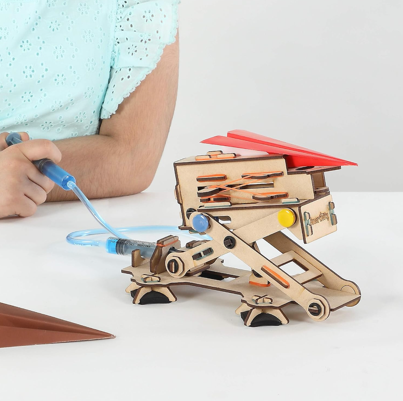 Have you ever wanted to launch paper planes through a machine? With this kit you will build your very own hydraulic-powered Plane Launcher. Once built, fill the syringe with water and press the syringe to launch the paper plane and soft missile. Watch the launcher rise and thrust plane and missle intot he air. The kit comes with easy to follow instructions, STEM concept explanations, and experiments that kids can do independently. Ages 6+.
