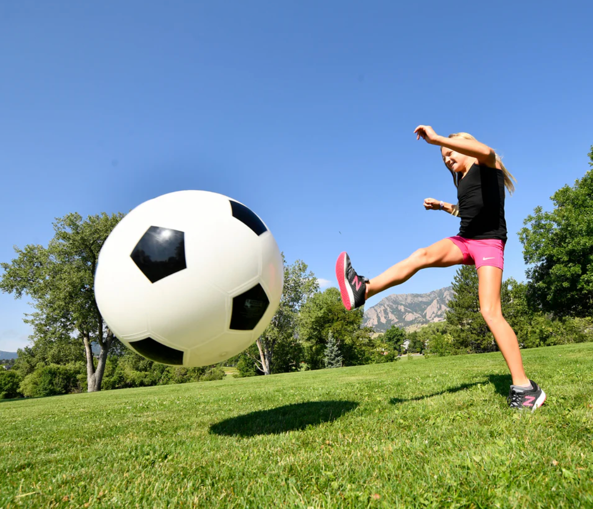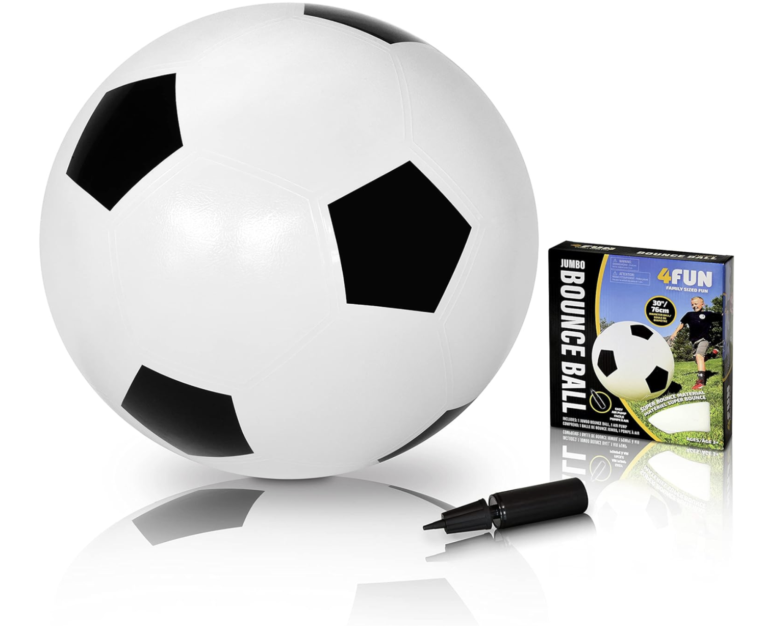 Add jumbo fun when kids play outside with our Jumbo Soccer Bounce Ball! This 30" bounce ball adds excitement to everyday soccer games for a few kids, an entire team or even a family to scrimmage! The ball uses a standard air pump (included) to inflate, and is easy to deflate and store away when kids are finished playing. Made of durable, UV resistant rubber material. Ages 3+