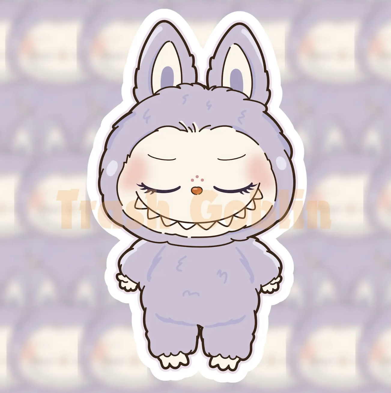 Add a pop of pastel to your life with this closed-eyed Labubu vinyl sticker. Perfect for laptops, water bottles, and more! Keep your eyes closed, but don't sleep on this quirky and fun sticker! Approx. 3 inches. Designed by Trash Goblin.