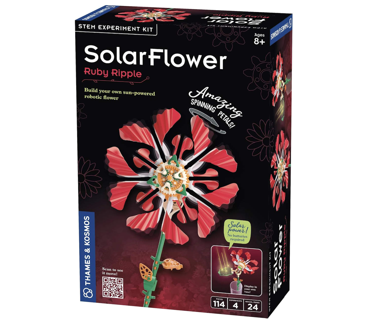 Build this beautiful kinetic sculpture, a motorized flower model with moving petals, powered by a solar panel. Learn about mechanical systems like motors and planetary gears, and about how solar cells generate electricity to power the flower. An ingenious design allows all petals to rotate synchronously, driven by a single motor, resulting in a mesmerizing optical illusion effect. This flower will never wilt, and you will never run out of batteries; it runs whenever the sun shines on it. Product Dimensions: 7.3 x 11 x 3.5 in. Ages 8+